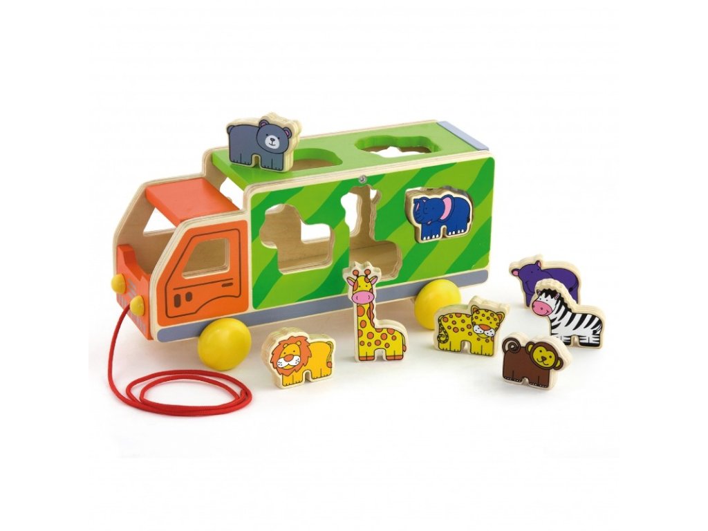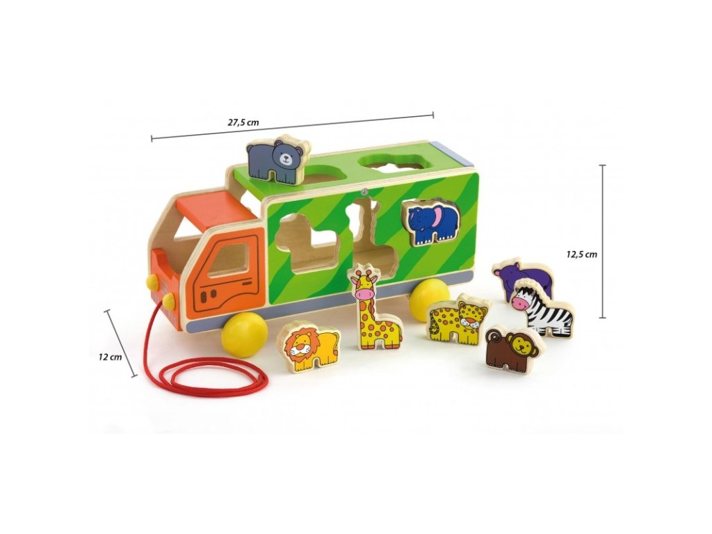 A fablokk teherautó különféle állatokat tartalmaz. A teherautó 8 különböző színű és formájú állatot tartalmaz. A fa teherautó tökéletes minden kisgyermek számára. Nagyon szép és szemet gyönyörködtető színekben pompázó játék, amely valószínűleg minden gyermeket játékra ösztönöz. A játék teljes egészében fából készült. A fa teherautóban állatok vannak, amelyeket a számukra kijelölt lyukakba kell helyezni. Minden állatnak más a formája és színe. Az állatok megfelelő lyukakba helyezése fejleszti a gyermek érzékelését és serkenti a képzeletét, és mindenekelőtt vidám szórakozást biztosít. A játék során a gyermek megtanulja megkülönböztetni a formákat és a színeket. A fából készült állatszállító teherautó madzagot is tartalmaz, így gyermeke elviheti sétálni. A háziállatok könnyen eltávolíthatók a hátsó ajtó behajtásával.