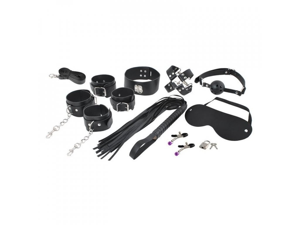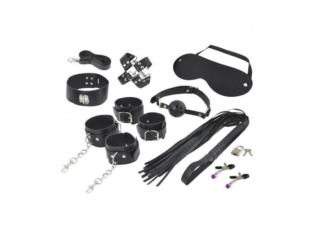 Erotikus segédeszközökkel teli készlet a bátrak számára, akik nem félnek kipróbálni valami újat és ismeretlent. Egyetlen dominó vagy rabszolga sem lehet bilincs nélkül, rövidebb lánccal és gallérral összekötve, amit zárral zárhatsz, majd kidobhatod a kulcsot. Egy póráz, amellyel kéznél tarthatja az engedelmességét, a nélkülözhetetlen geg, szemmaszk és szexi bimbóbilincsek lila harangokkal. A hosszú rojtokkal ellátott ostorok jó verést adnak partnerének.