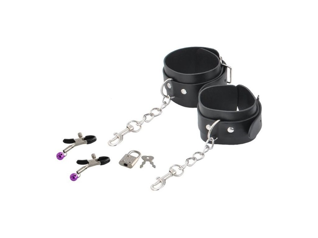 Nagyszerű készlet erotikus segédeszközökkel a bátrak számára, akik nem félnek kipróbálni valami újat és ismeretlent. Egyetlen domina vagy rabszolga sem nélkülözheti bilincseket, amelyeket rövidebb lánc köt össze, nyakörvet, amelyet zárral zárhatsz, majd kidobhatod a kulcsot, pórázt, amely lehetővé teszi, hogy kéznél tartsd az alázatos feledet, a nélkülözhetetlen szájpecek golyóval,, egy szem maszk és szexi mellbimbós kapcsok lila harangokkal.