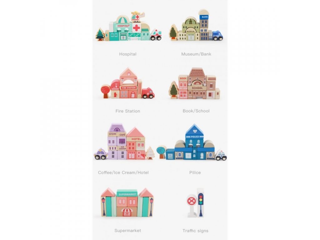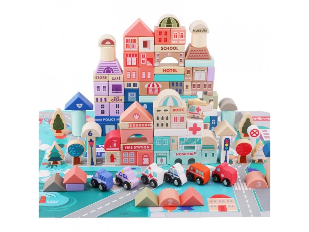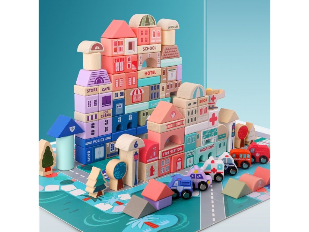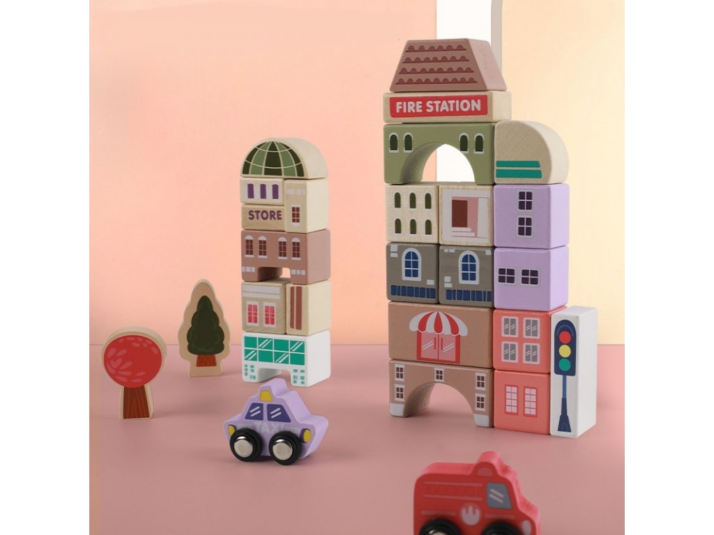 - A tömbök fák, házak, autók stb. mintájával vannak festve.