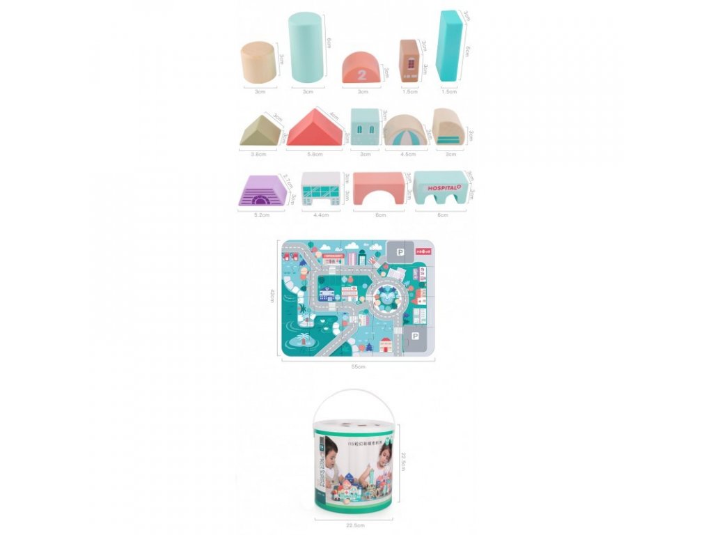 A készlet 115 különböző formájú, mintázatú és színű elemet tartalmaz, lehetővé teszi a gyermek számára, hogy különböző szerkezeteket építsen, és sok szórakozást biztosít számára. Ez a játék megtanítja a gyermeket az alapvető geometriai formák és színek felismerésére. Segíti a kreativitás és a térbeli és logikus gondolkodás képességének fejlesztését is. Bónuszként a vödör fedelét válogatóval látták el, amelyen a gyermek gyakorolhatja kézügyességét és logikus gondolkodását.