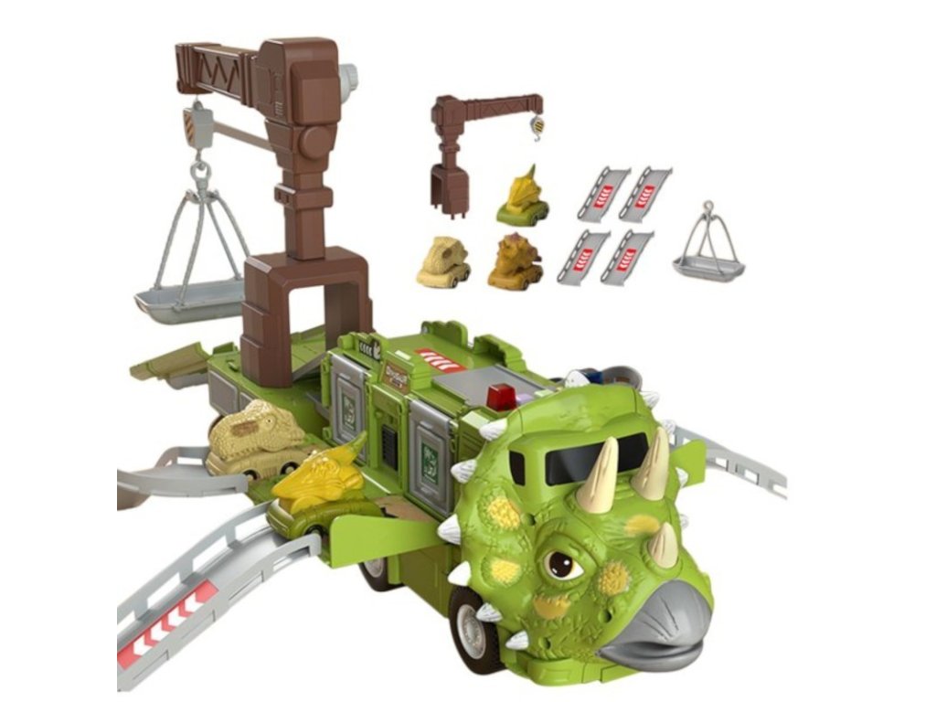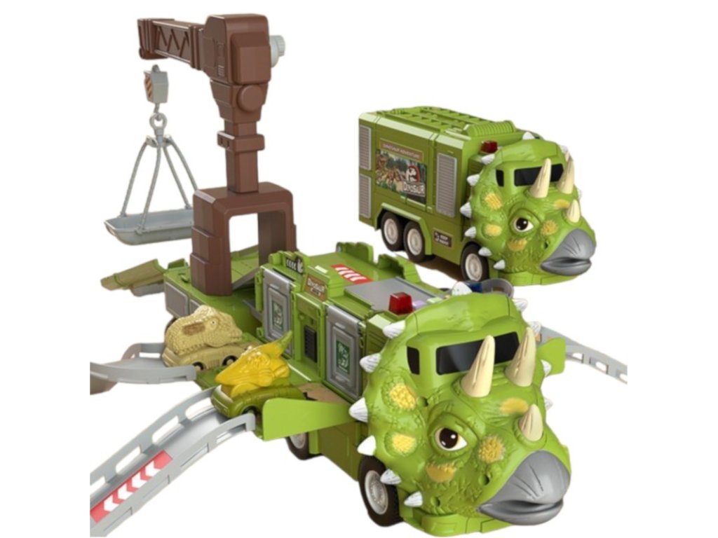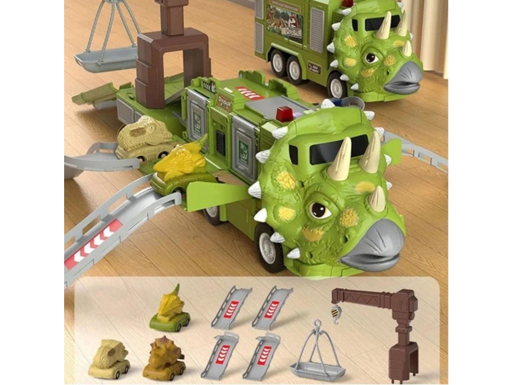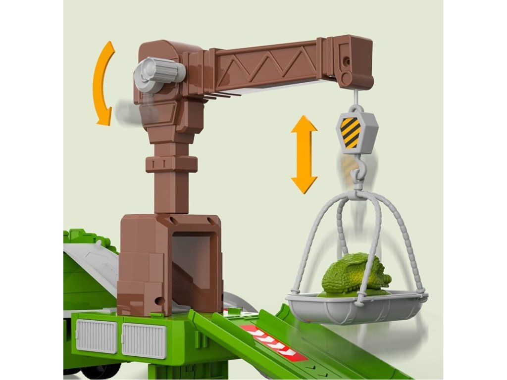 A dinoszaurusz teherautónak van egy nyitható pótkocsija, amely rámpát hoz létre a játékautók számára, és egy helyet a darukar felszerelésére. A daru aljában lévő alagútnak köszönhetően a játékautó a teherautó legtetejétől leengedhető a pályán. A teherautó a félpótkocsi mindkét oldalán lehetőséget biztosít 4 db kisebb rakodó rámpa csatlakoztatására a félpótkocsihoz, melyek segítségével a játékautók könnyedén elérhetik a triceratopok hátulján található 2 db garázst. A garázsok mindkét oldalról nyithatók, így a játékautó át tud haladni a rakodó rámpákon és a kamion másik oldaláról kiszállni. Ezenkívül a daru platformmal rendelkezik, amelynek köszönhetően felemelheti és leengedheti az autókat. A daru oldalán elhelyezett kézi vezérlésű forgó csörlő segítségével működik.