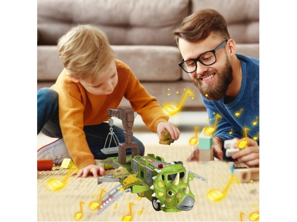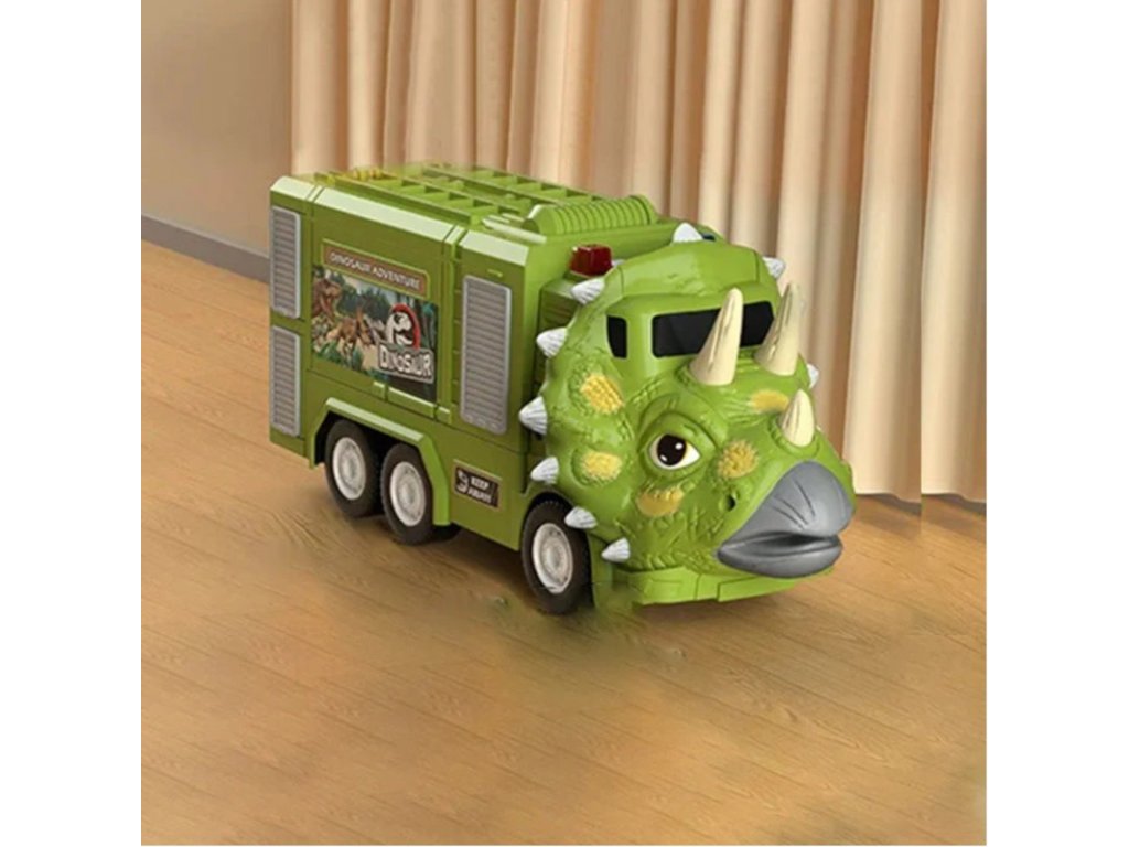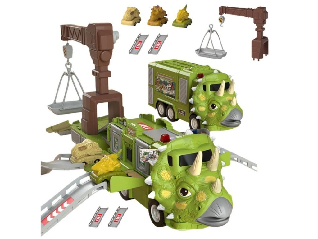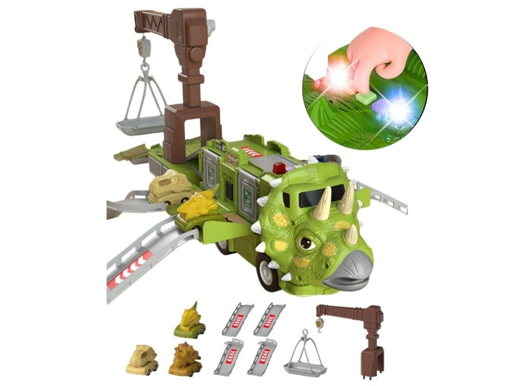 A dinoszaurusz teherautónak van egy nyitható pótkocsija, amely rámpát hoz létre a játékautók számára, és egy helyet a darukar felszerelésére. A daru aljában lévő alagútnak köszönhetően a játékautó a teherautó legtetejétől leengedhető a pályán. A teherautó a félpótkocsi mindkét oldalán lehetőséget biztosít 4 db kisebb rakodó rámpa csatlakoztatására a félpótkocsihoz, melyek segítségével a játékautók könnyedén elérhetik a triceratopok hátulján található 2 db garázst. A garázsok mindkét oldalról nyithatók, így a játékautó át tud haladni a rakodó rámpákon és a kamion másik oldaláról kiszállni. Ezenkívül a daru platformmal rendelkezik, amelynek köszönhetően felemelheti és leengedheti az autókat. A daru oldalán elhelyezett kézi vezérlésű forgó csörlő segítségével működik.