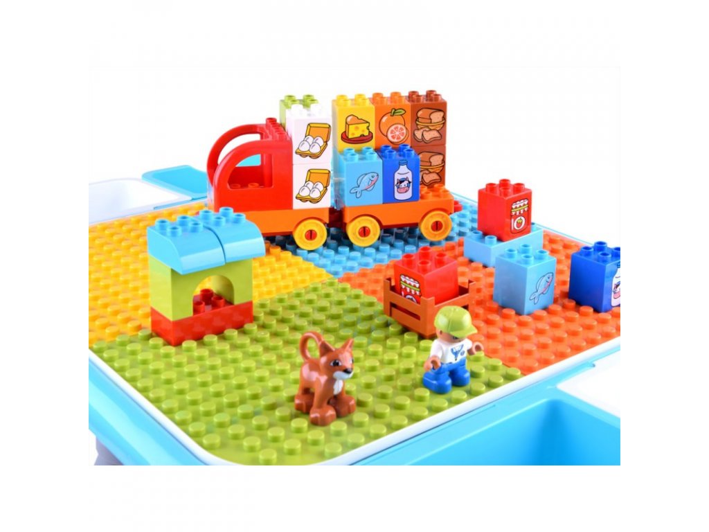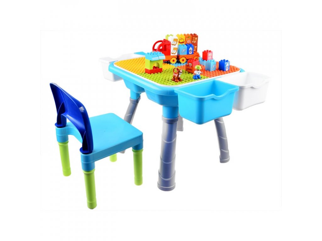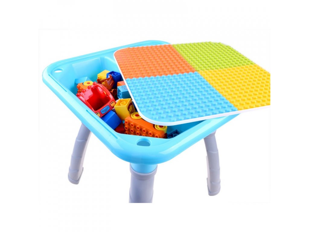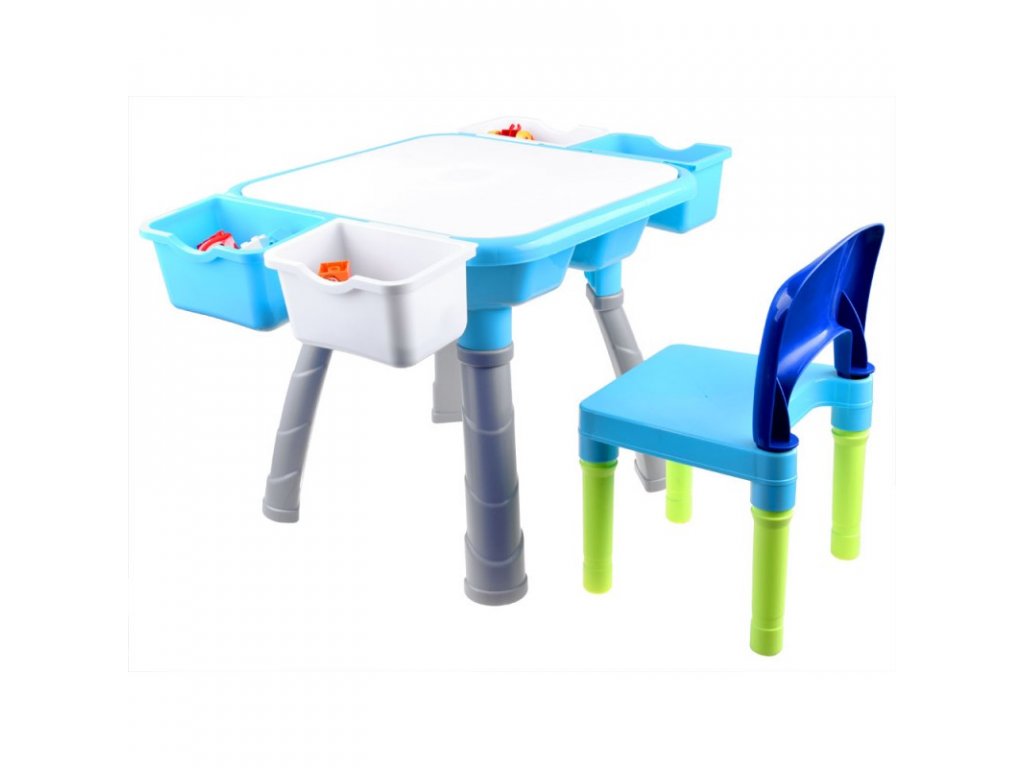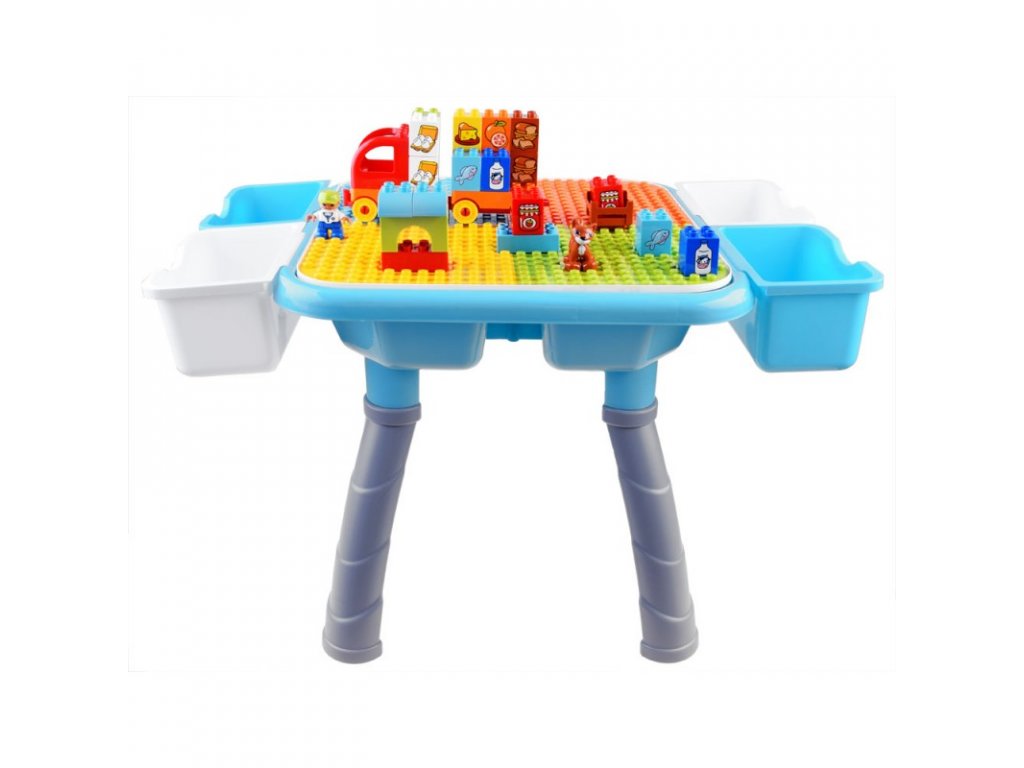 A többfunkciós asztal építőkockákkal gyerekeknek készült. Az asztallap kétoldalas, egyik oldala sima felületű és a gyerek íróasztalként használhatja rajzoláshoz, festéshez, gyurma formázáshoz stb. Az asztallap másik oldala kockák egymásra rakására alkalmas. Az egész készlet tömör műanyagból készült, vonzó színekben. Az asztal oldalára 4 fiókot szerelhetsz fel, melyekben építőkockákat vagy egyéb játékokat tárolhatsz. Köszönhetően annak, hogy a teljes készlet tömör műanyagból készült, könnyen mosható és megtisztítható a szennyeződésektől.