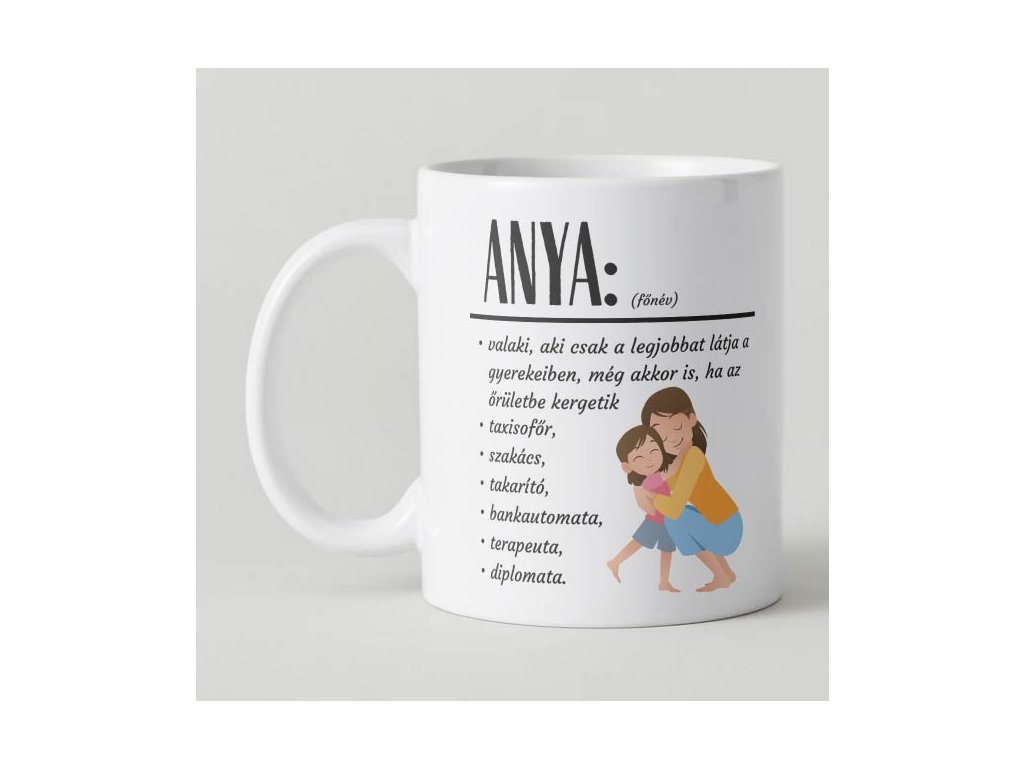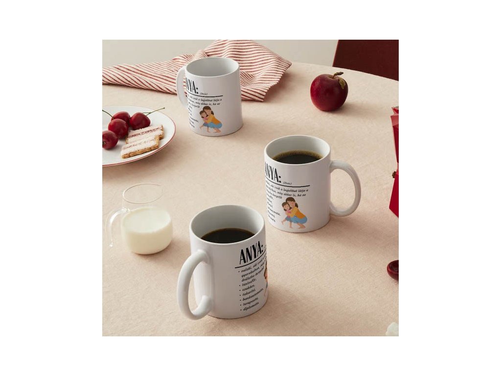 A bögre klasszikus fehér dizájnnal rendelkezik, amelyet gyengéd és szeretetteljes nyomat díszít, olyan motívumokkal, amelyek az anyaságot és az anyák végtelen szeretetét ünneplik gyermekeiknek. A szublimációs nyomtatási technika gondoskodik arról, hogy a képek, szövegek élesek, élénkek és fakulásállóak legyenek, így a bögre végső megjelenése sok használat után is szép marad.