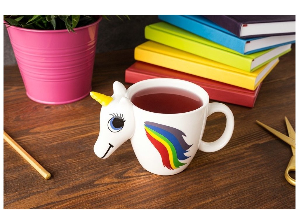 Aranyos egyszarvú bögre 3D-s arccal és szarval. Csak öntsön bele meleg vizet, és a bögre elkezd színt változtatni. Ez egy tökéletes ajándék mindenegyszarvú vagy tea imádónak. Az egyszarvú mágikus érzéseket vált ki, ezért nagyszerű ajándék mindenki számára, aki kedveli a mágikus pillanatokat.