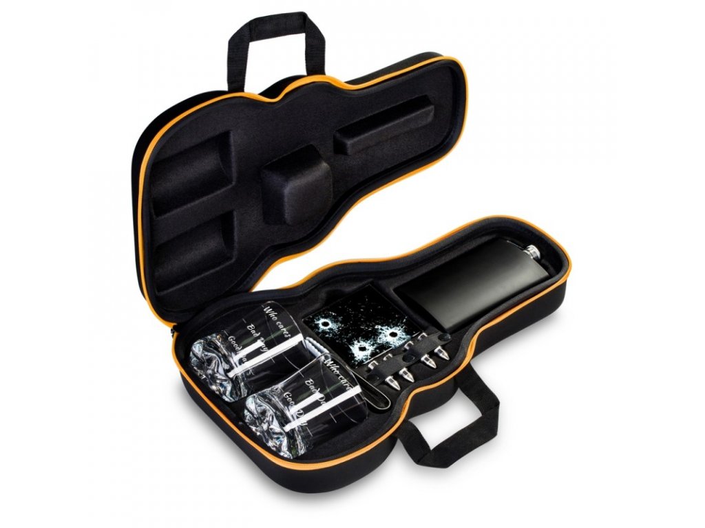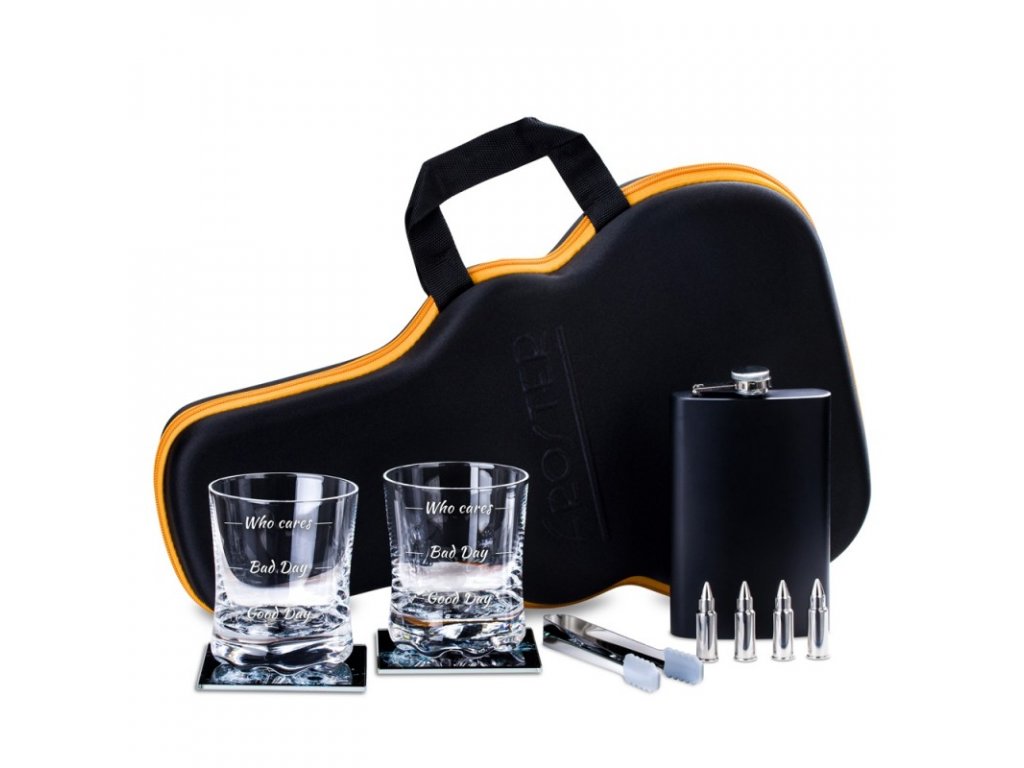 Stílusos whiskys üvegpoharak, vicces fehér nyomattal díszítve, amely tudatni fogja mindenkivel, milyen nehéz volt a napod. A nagy, két poharat tartalmazó készlet stílusos poháralátéteket, italhűtőpatronokat, matt kivitelű fekete lapos tányért és jégfogót is tartalmaz. A whisky szerelmeseinek szánt készlet egy rendkívül esztétikus, precízen megformált, gitár formájú táskába van csomagolva. A táska praktikus fogantyúival könnyen és biztonságosan hordozható. Nagyszerű ötlet, hogy minden whisky szerelmesének igazán eredeti módon kedveskedjen.