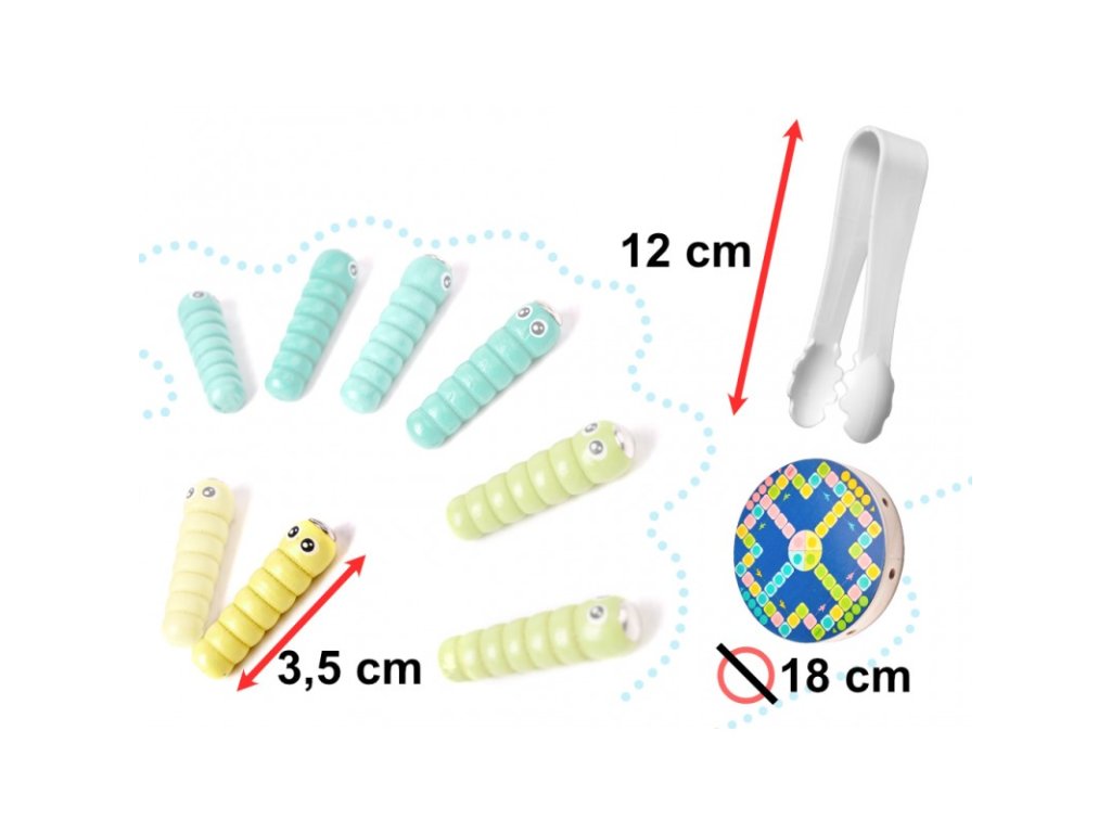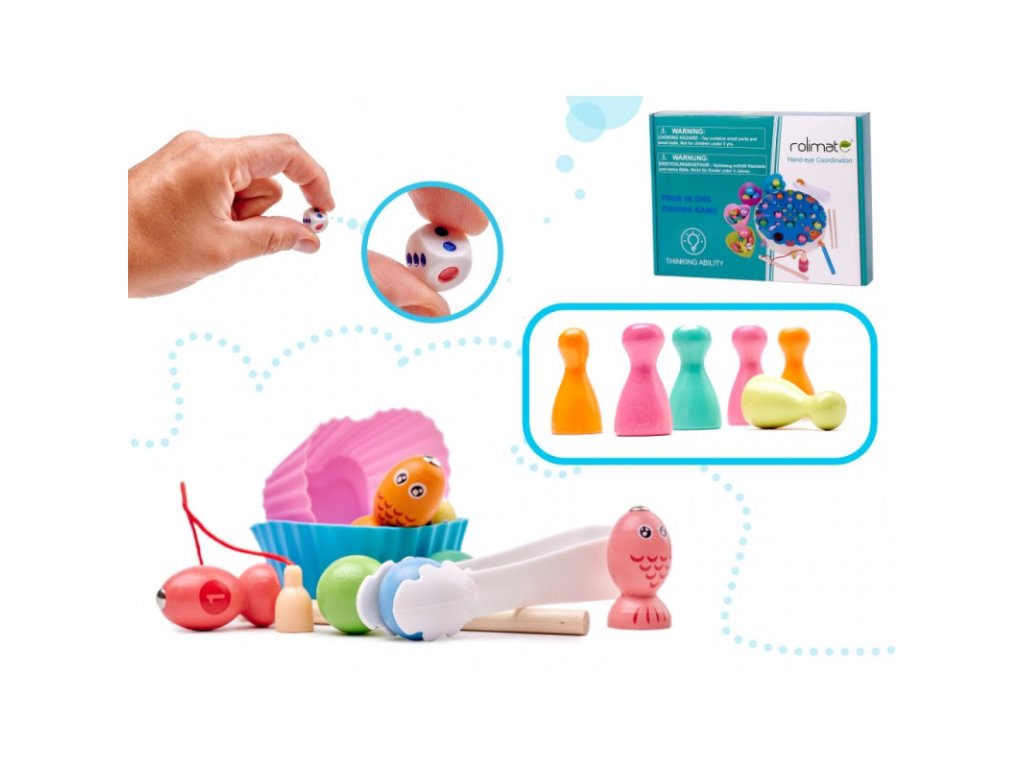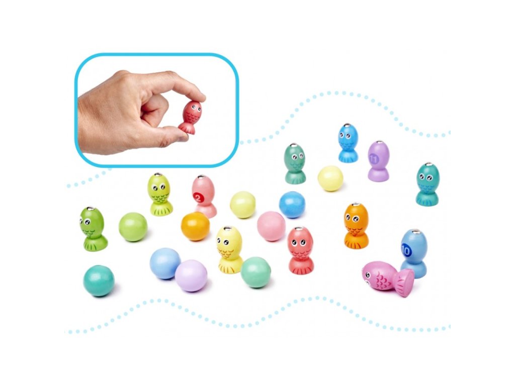 Tökéletes játékkészlet a kicsiknek, mely nem csak hosszú órákon át nyújt szórakozást, de a gyermek megfelelő fejlődését is segíti. A csipesszel halfogás vagy mozgó elemek kiválóan fejlesztik a gyerekek motorikus készségeit és kézügyességét. Ezenkívül gyakorolja a szem-kéz koordinációt és a kéz pontosságát. Minden elem kellemes színben vonzza a gyermek figyelmét és játékra ösztönzi. A játék biztosítja a gyermek teljes körű fejlődését - fejleszti a kézi készségeket, de a kognitív funkciókat és a logikus gondolkodást is. A legtöbb elem sima polírozott fából készült, és biztonságos festékkel van festve – ez garantálja a biztonságot játék közben. A horgászdeszka szép grafikákkal rendelkezik, amelyek különféle vízi állatokat és növényeket ábrázolnak. Ez serkenti gyermeke fantáziáját, és pontosabb horgászatra ösztönöz. A sok elem ideális ahhoz, hogy több gyerek játsszon egyszerre - az egyik halat fog ki, a másik pedig férgeket távolít el? Biztosan szórakoztatóbb lesz együtt!