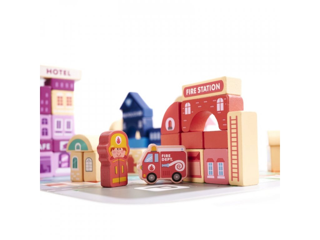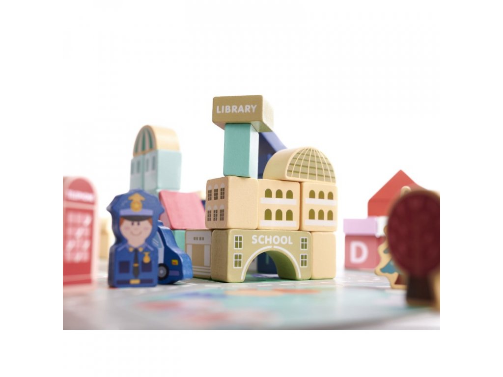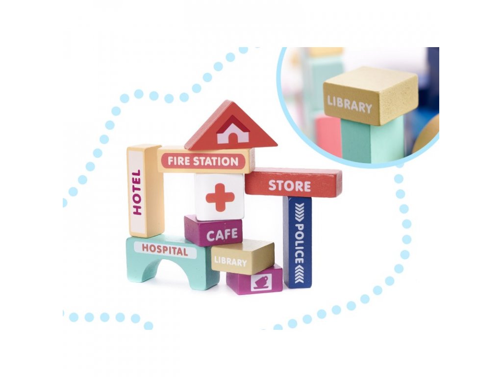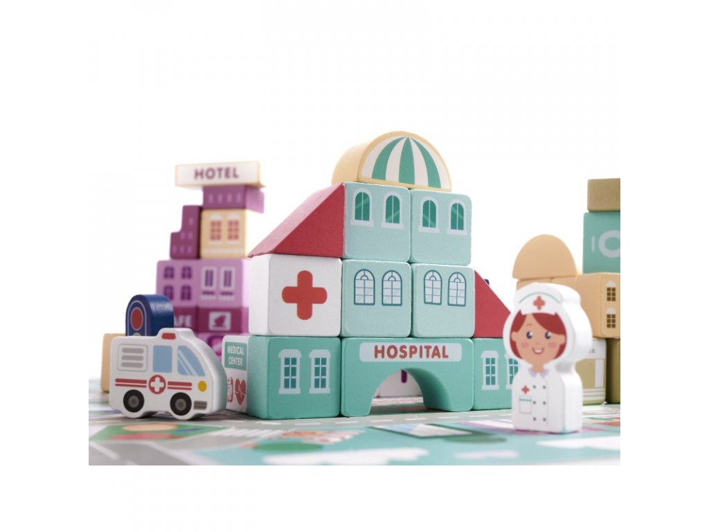 - különböző formájú színes kockák, rendőrőrsök, bolt, kórház, múzeum, bank, iskola, tűzoltószertár épület, kávézó stb.