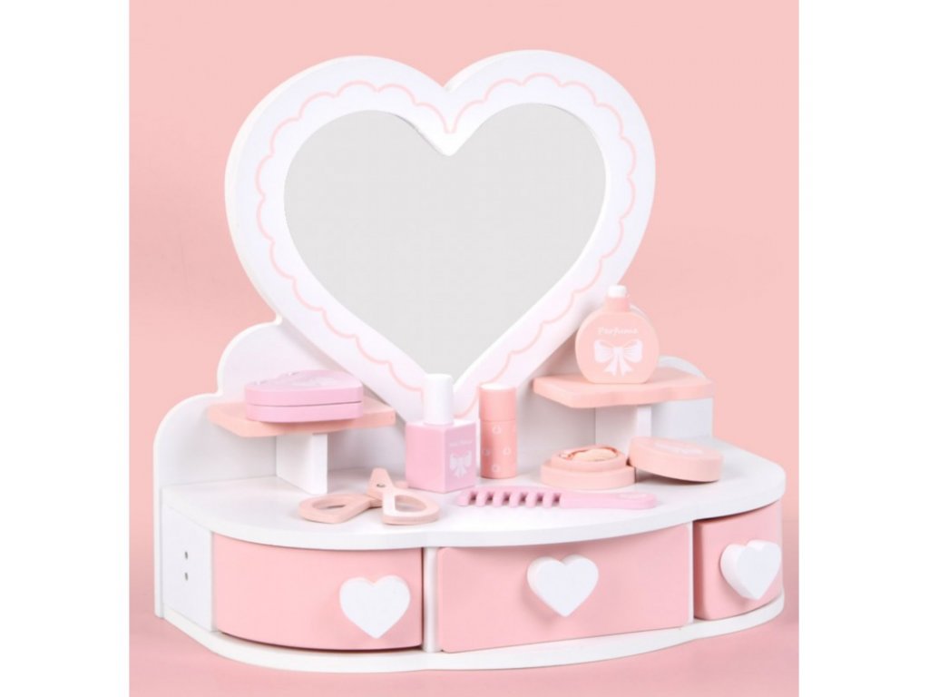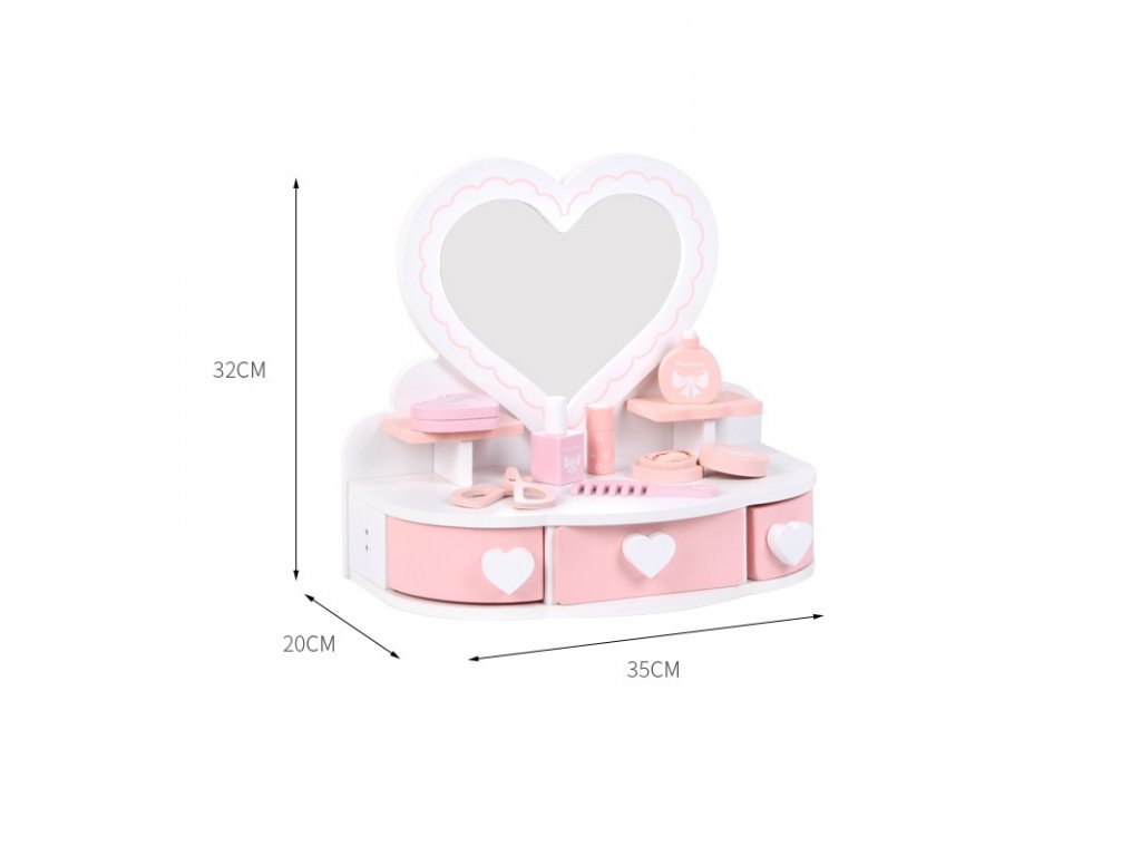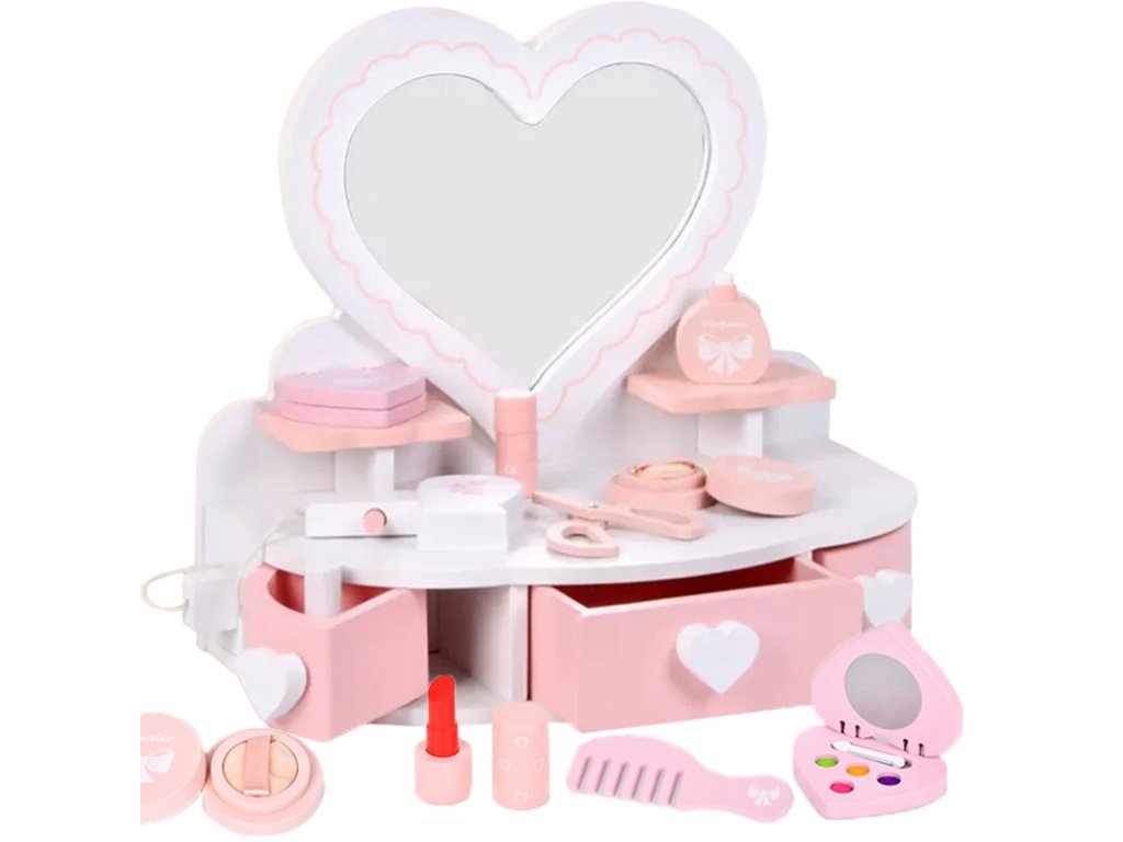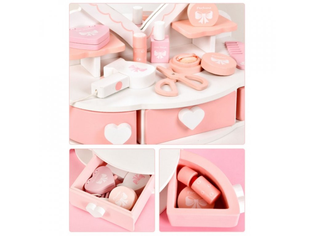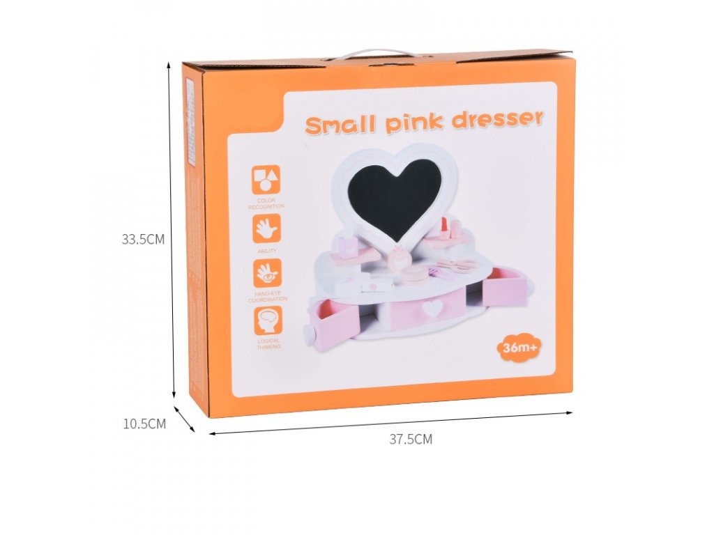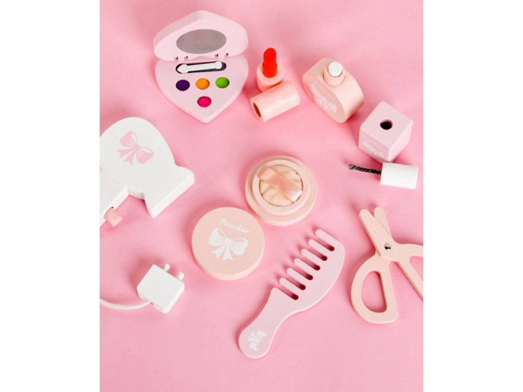 Fantasztikus játék kislányoknak, akik szeretik anyjukat utánozni a mindennapi szépségrituálék végrehajtása során. Minden kis szépséglány saját kozmetikumokról és kiegészítőkről álmodik, amelyek a lehető leghaszonosabbak a drogériákban és parfümériákban megvásárolhatóakhoz. Ennek a gyönyörű, fehér és rózsaszín színű fa készletnek köszönhetően minden kislányból díszes sminkes lehet. A készletben található összes kozmetikum és kiegészítő valódi, felnőtt nők által használt szerszámok utánzata, amelyek még vonzóbbá teszik a gyerekek játékát és megmozgatják kicsinyeink fantáziáját. Tedd boldoggá kis hercegnődet még ma, és szerezz neki egy játékot, amiben nem fog megunni :)