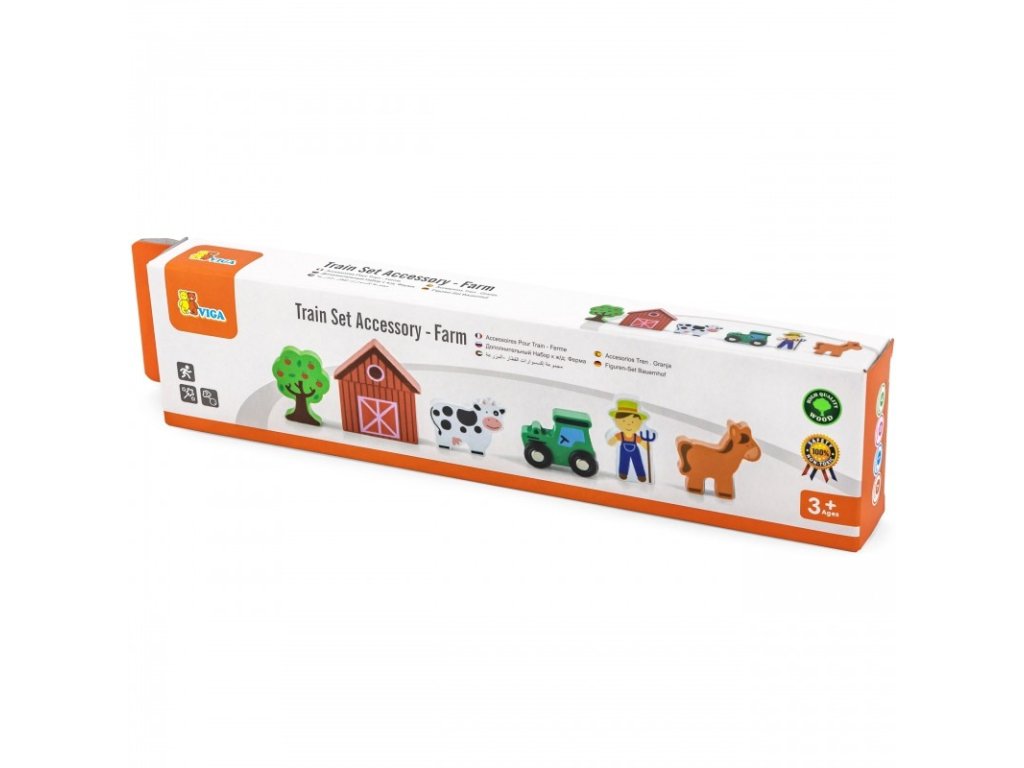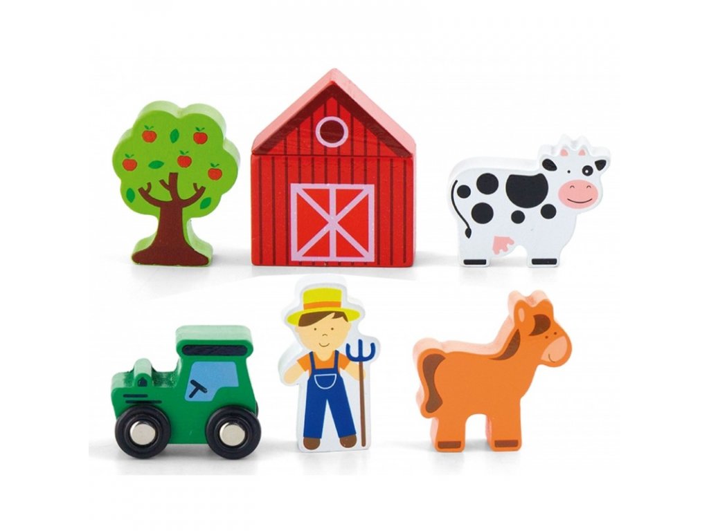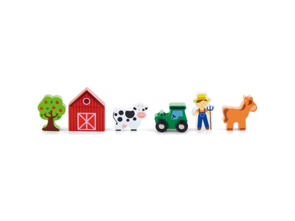 A fából készült gyermekfigurák megtanítják gyermekeit az állatok és a farm életének megismerésére. A figurák egyik gyerekszobából sem hiányozhatnak. A fából készült figurák készlete 6 elemből áll - egy farmer, egy fa, egy ló, egy gazdasági épület, egy traktor, egy tehén és egy ló.