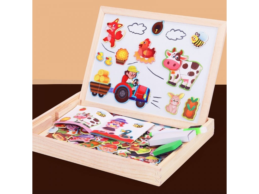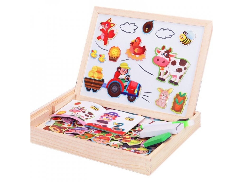 - A mágnesek/rejtvények remek játék a stressz oldására, mivel a készlet 82 elemet tartalmaz, így minden gyermek elfoglalt lesz a történetek komponálásával és mesélésével. A játék mellett megtaníthatjuk a gyereknek, hogyan viselkednek az állatok, milyen hangokat adnak ki vagy mit esznek. A készlet tartalmaz egy könyvet, amely segít a mese rendszerezésében, de ezt minden gyerek a maga módján és saját fantáziája szerint teheti meg. A mágnesek elrendezéséhez egy mágnestáblára helyezett hátteret is használhatunk, akkor úgy érezhetjük magunkat, mintha egy igazi farmon lennénk.
