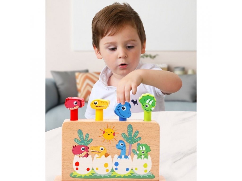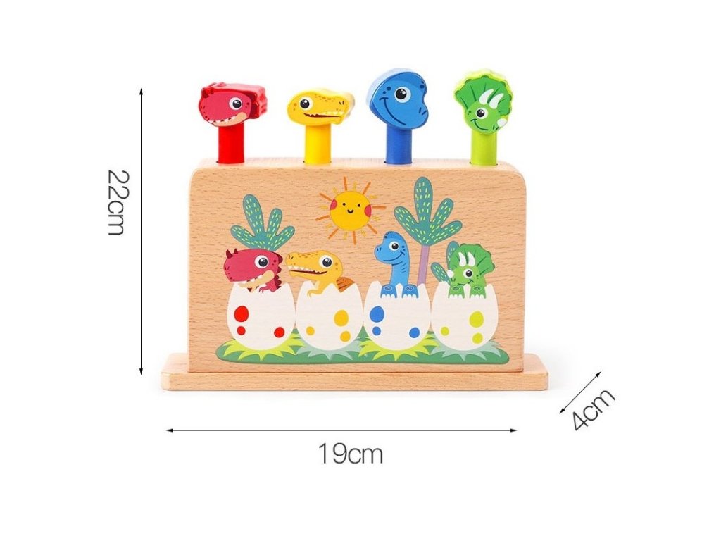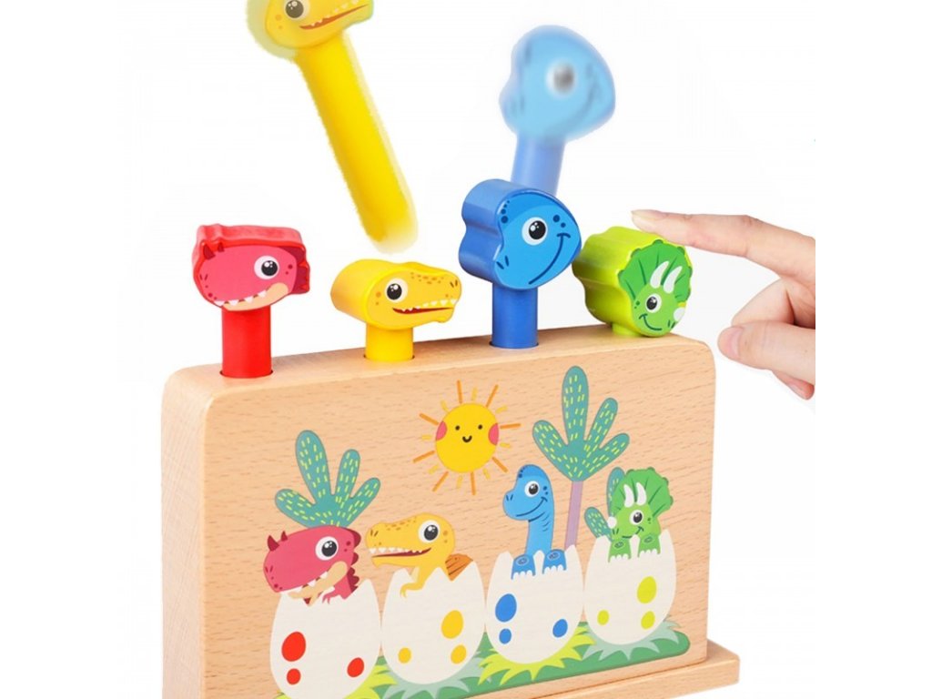 Egy aranyos fa játék egy sima fa alapon, különféle dinoszauruszok fejével, minden kis felfedezőt érdekelni fog. Ennek a játéknak köszönhetően az állandóan mozgásban lévő, túl sok energiával rendelkező gyerekek kedvükre játszhatnak. A játék lényege, hogy elkapjuk az ugráló dinoszauruszokat, vagy a lehető leggyorsabban a megfelelő helyre helyezzük őket. A játékszabályok tetszés szerint változtathatók, attól függően, hogy az adott pillanatban hogyan kérik a gyerekek. Ahhoz, hogy a dinoszaurusz ugorjon, csak erősen meg kell nyomni a fejét, és akkor a levegőbe repül. A játék természetes fából készült, nem mérgező festékekkel és lakkokkal festve, így azoknak a gyerekeknek is kiváló, akik hozzászoktak, hogy mindent a szájukba vesznek.
