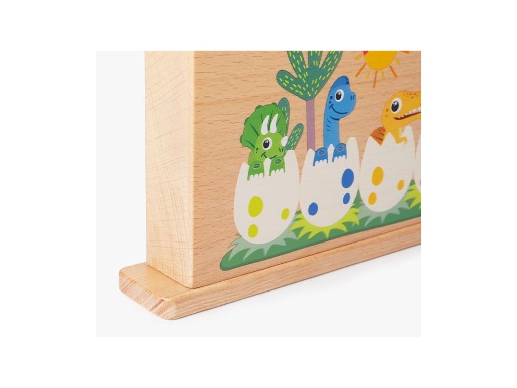 Egy aranyos fa játék egy sima fa alapon, különféle dinoszauruszok fejével, minden kis felfedezőt érdekelni fog.
