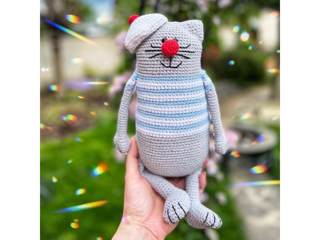 Bemutatjuk bájos horgolt cicánkat, Felixet Franciaországból. A szürke cica, aki kék-fehér csíkos "pólót", piros orrot és szép mosolyt visel, gyorsan gyermekei kedvenc társa lesz. Egyik jellegzetes eleme a gyönyörű barett, amely francia hatást és eleganciát kölcsönöz neki. Ez a barett különleges és összetéveszthetetlen társsá teszi. Puha és rugalmas felülete kellemes tapintású, így ideális ölelkezésre, ölelésre. Ez a kis barát nem csak gyerekeknek való; még a felnőtt állatbarátok is beleszeretnek varázsába és barátságos megjelenésébe.