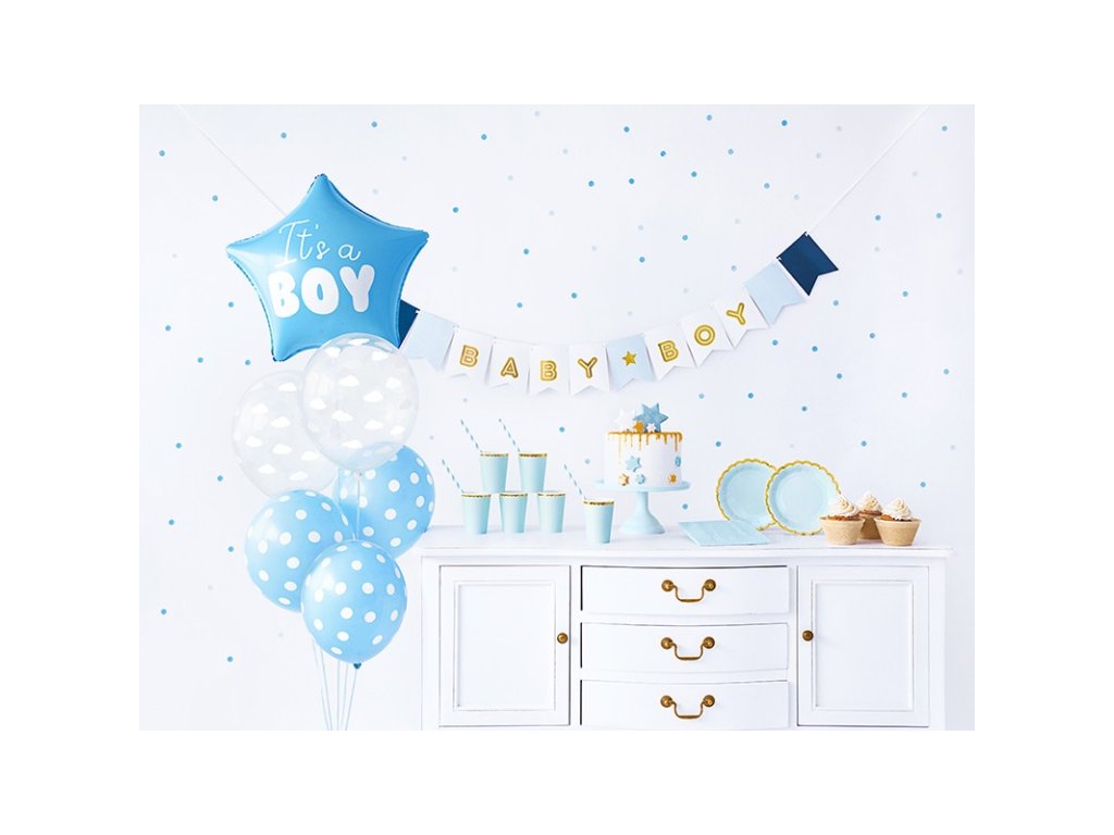 - A szett csomagjában It's a Boy - 1x Garland It's a Boy, 6x papírpohár, 6x papír tányér, 10x papír szívószál, 20x papírszalvéta, 1x fólia lufi csillag It's a Boy, 2x átlátszó latex lufi felhőkkel, 3x kék latex pontokkal ellátott lufik