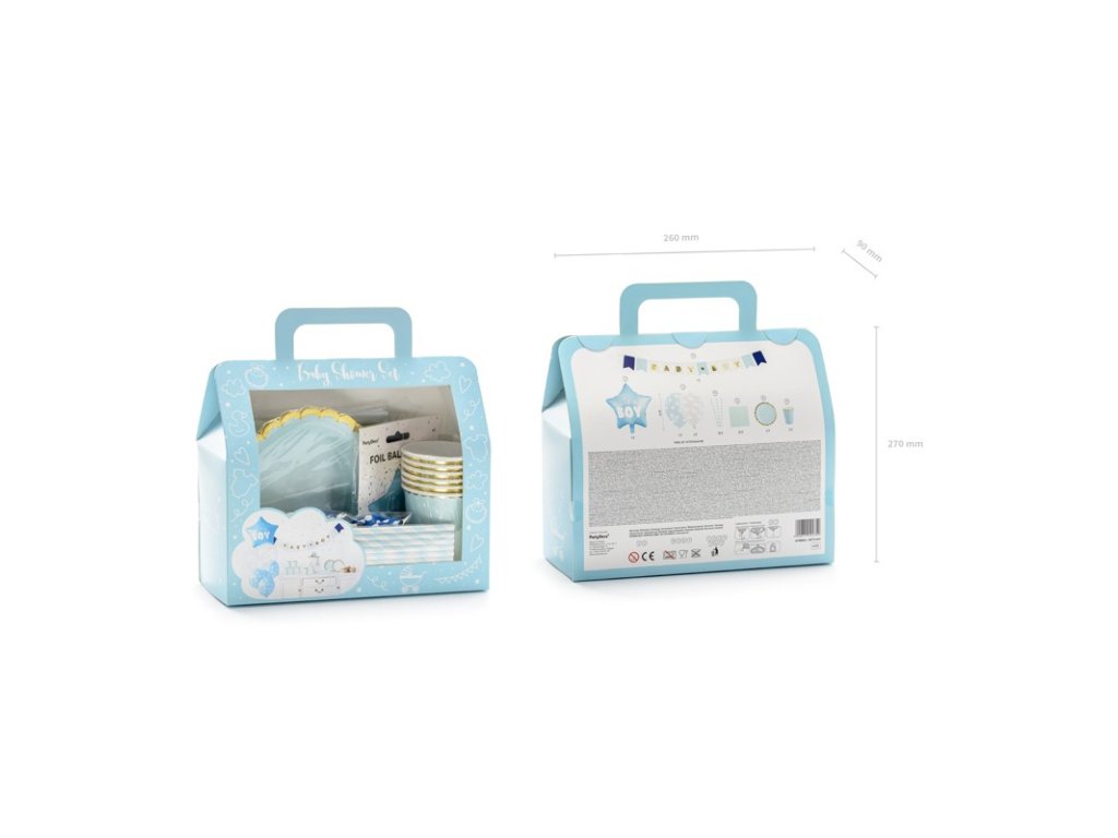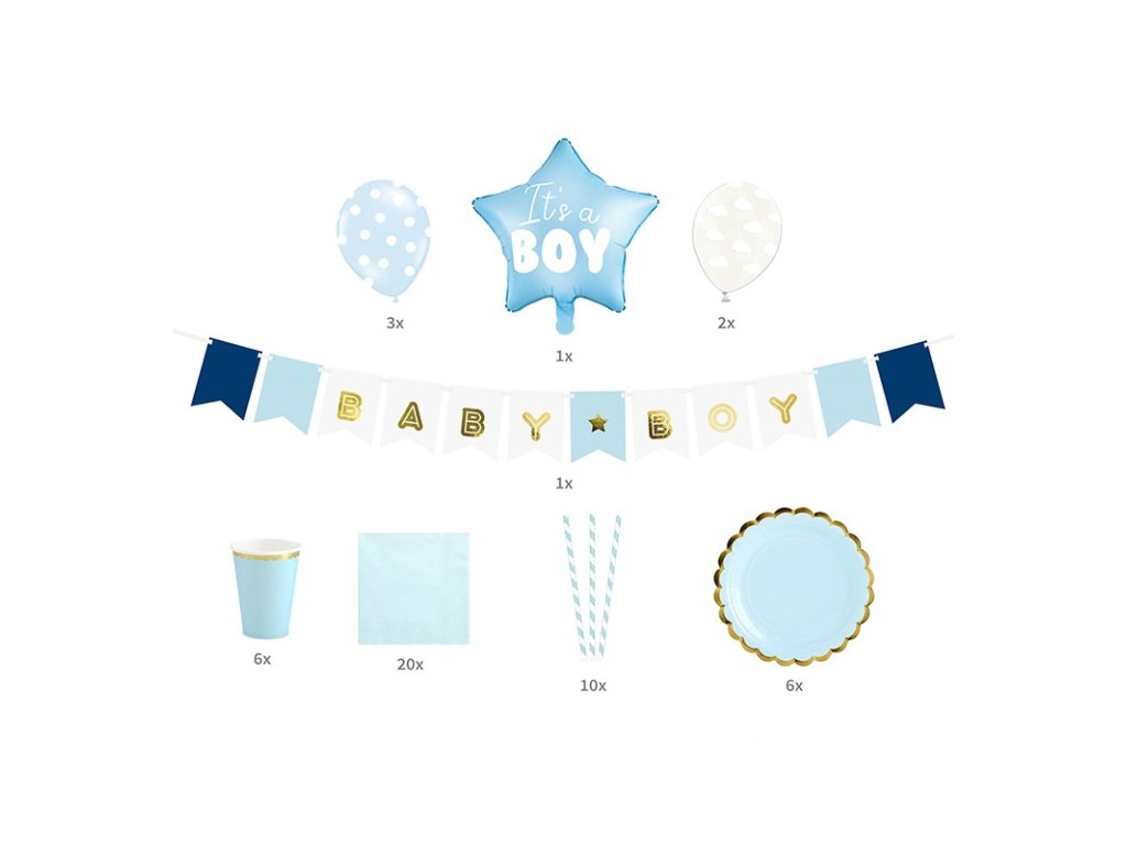 - A szett csomagjában It's a Boy - 1x Garland It's a Boy, 6x papírpohár, 6x papír tányér, 10x papír szívószál, 20x papírszalvéta, 1x fólia lufi csillag It's a Boy, 2x átlátszó latex lufi felhőkkel, 3x kék latex pontokkal ellátott lufik