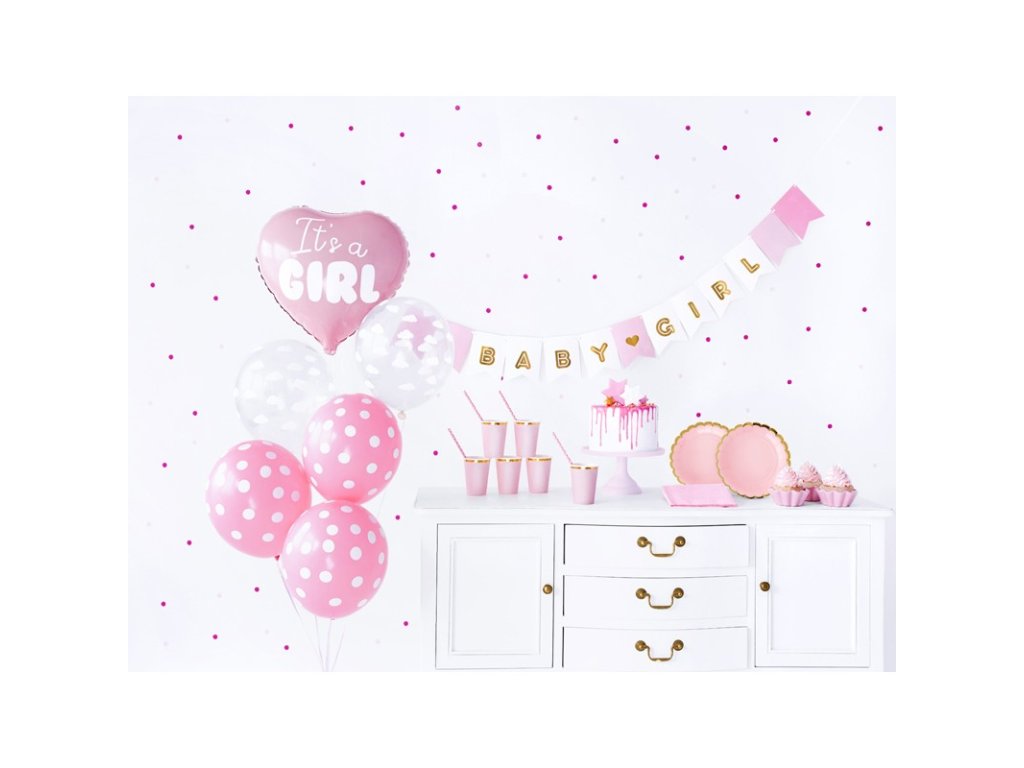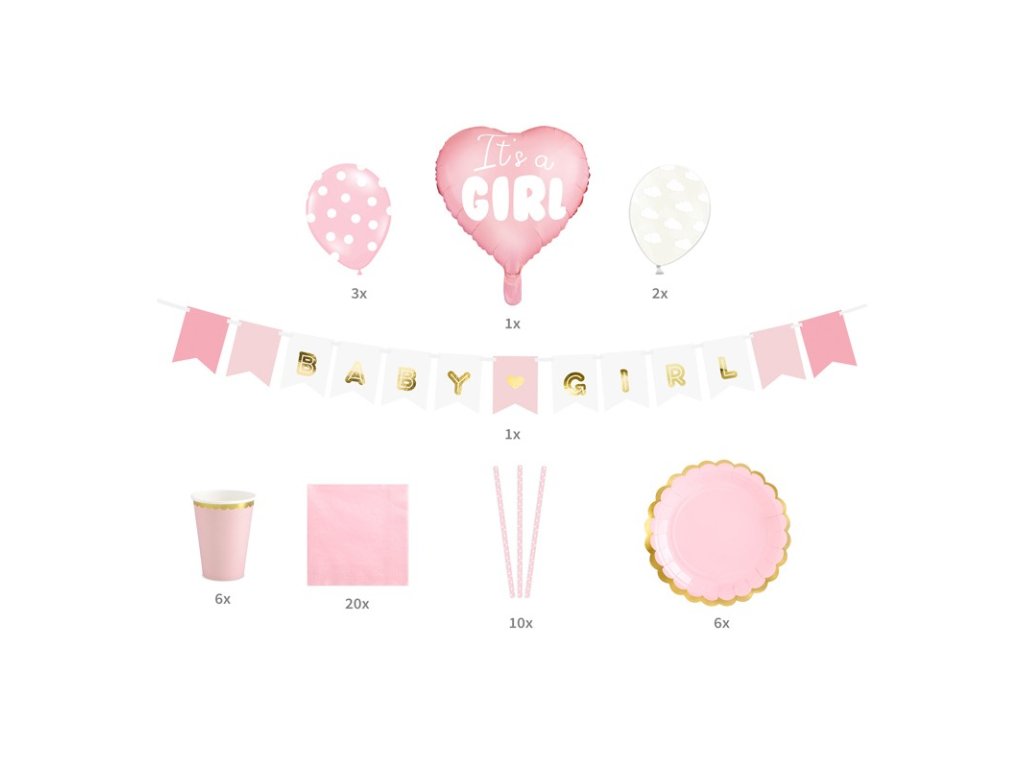 - A szett csomagjában It's a Girl - 1x Garland It's a Girl, 6x papírpohár, 6x papírtányér, 10x papír szívószál, 20x papírszalvéta, 1x fólia lufi szív It's a Girl, 2x átlátszó latex lufi felhőkkel, 3x rózsaszín latex pontokkal ellátott lufik