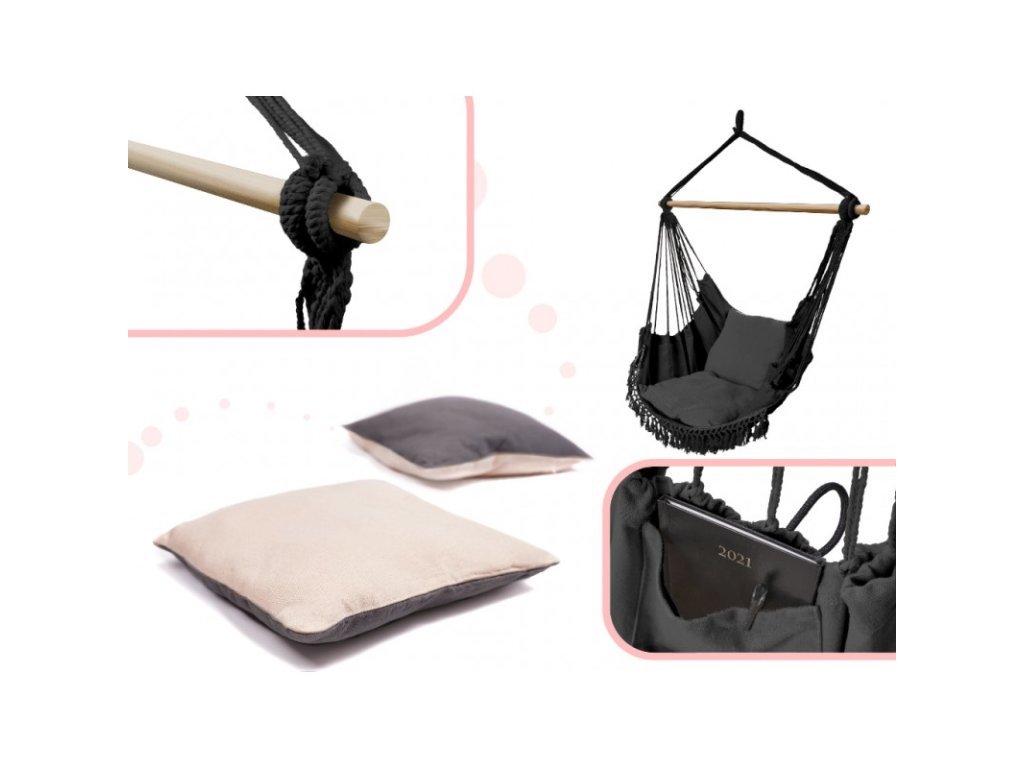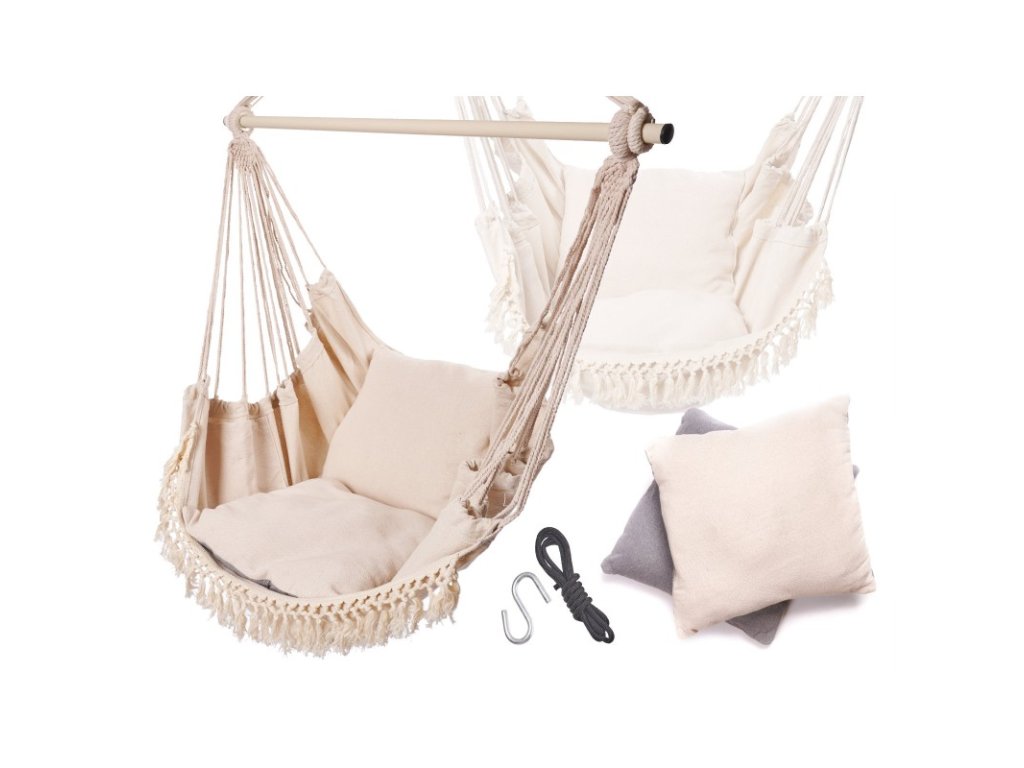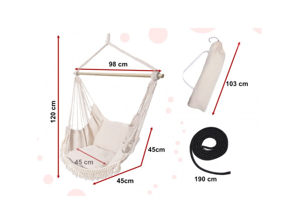 Kényelmes szék formájú függőágy, brazil stílusban. Függőágy és szék kombinációja egyben! Felejthetetlen kikapcsolódást biztosít a kertben, a teraszon vagy a házban. Ideális szabadtéri tevékenységekhez. Rendkívül funkcionális, és az élénk színek minden enteriőrbe illeszkednek.