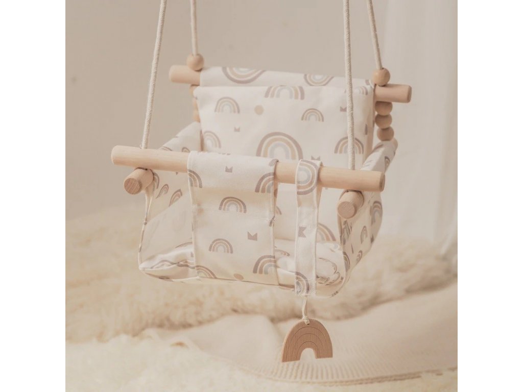 Rainbow Cotton Swing – Tökéletes szórakozás és kényelem kisgyermeke számára! Az idő gyorsan telik, és a kisgyermek gyorsan nő. A Rainbow Cotton Swing segítségével a legjobb szórakozást és kényelmet nyújthatja neki, amit megérdemel. Hinánk puha és kellemes pamutból készült, hogy gyermeke a luxus és a kényelem érzését élvezze. A Rainbow hinta a kisgyermek biztonságát és kényelmét szem előtt tartva készült. Erős és stabil vázának köszönhetően gyermeke biztonságosan hintázhat, és többé nem kell attól tartania, hogy a hinta felborulhat. A pamuthinta oldalain található fa korlátok mindig készen tartják a szövetszerkezetet a következő kalandra, a hintához erősített faelemek pedig elég sokáig tartják a babát a mozgásban ahhoz, hogy pihenhessen, miközben a baba ringat. A Rainbow Cotton Swing stílusos és modern dizájnnal is rendelkezik, amely minden gyerekszobába illeszkedik. Ideális játékos pillanatokhoz, kikapcsolódáshoz, valamint a kisgyermek egyensúlyának és motorikus képességeinek fejlesztéséhez.