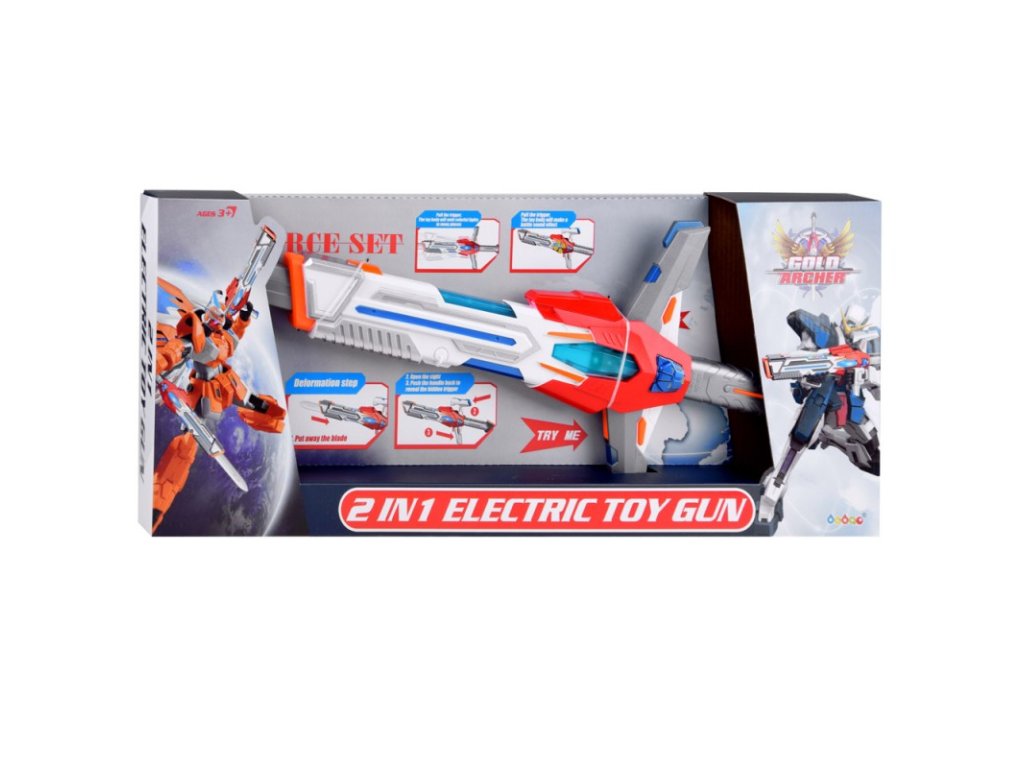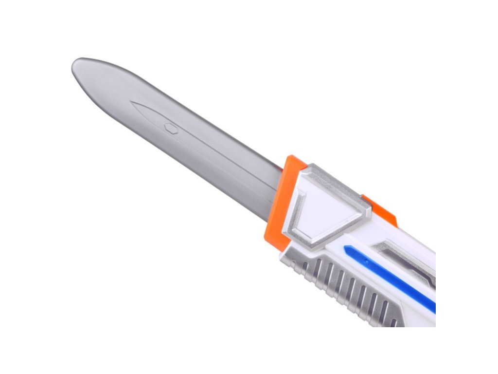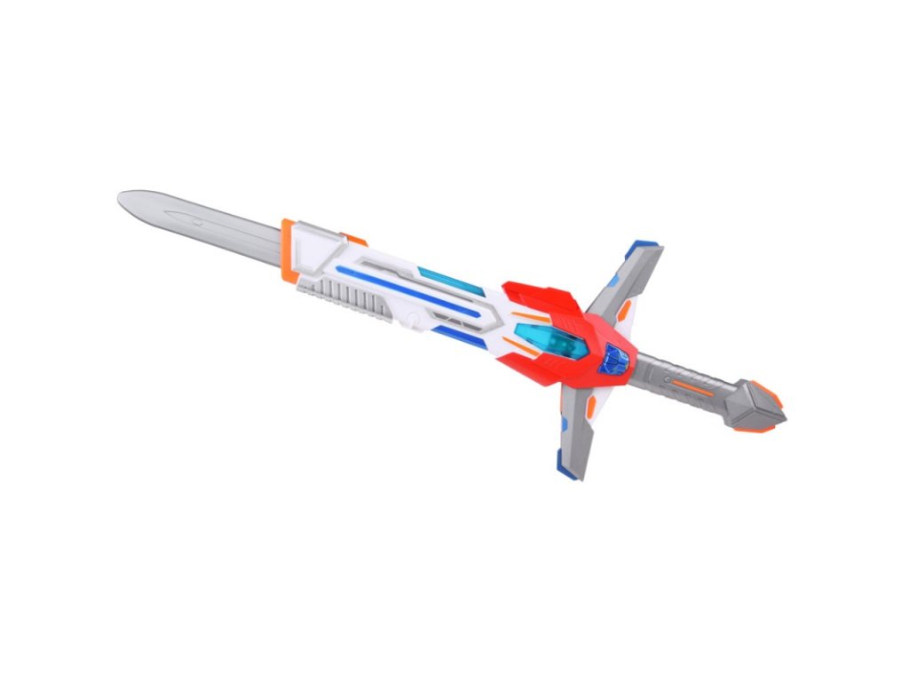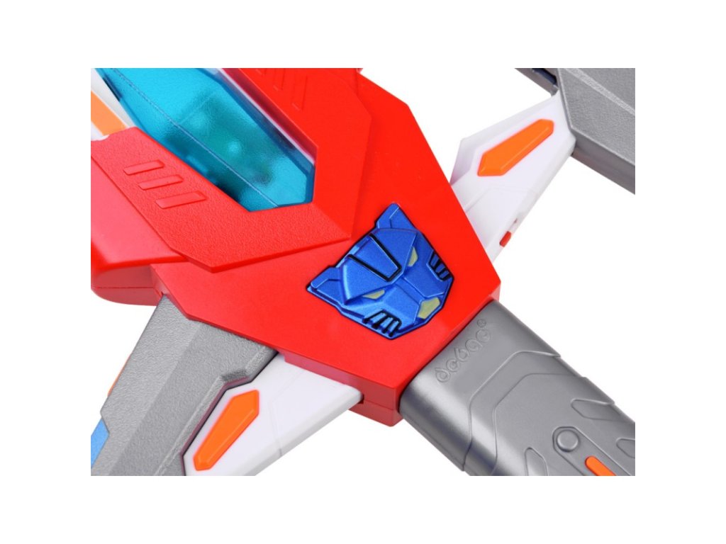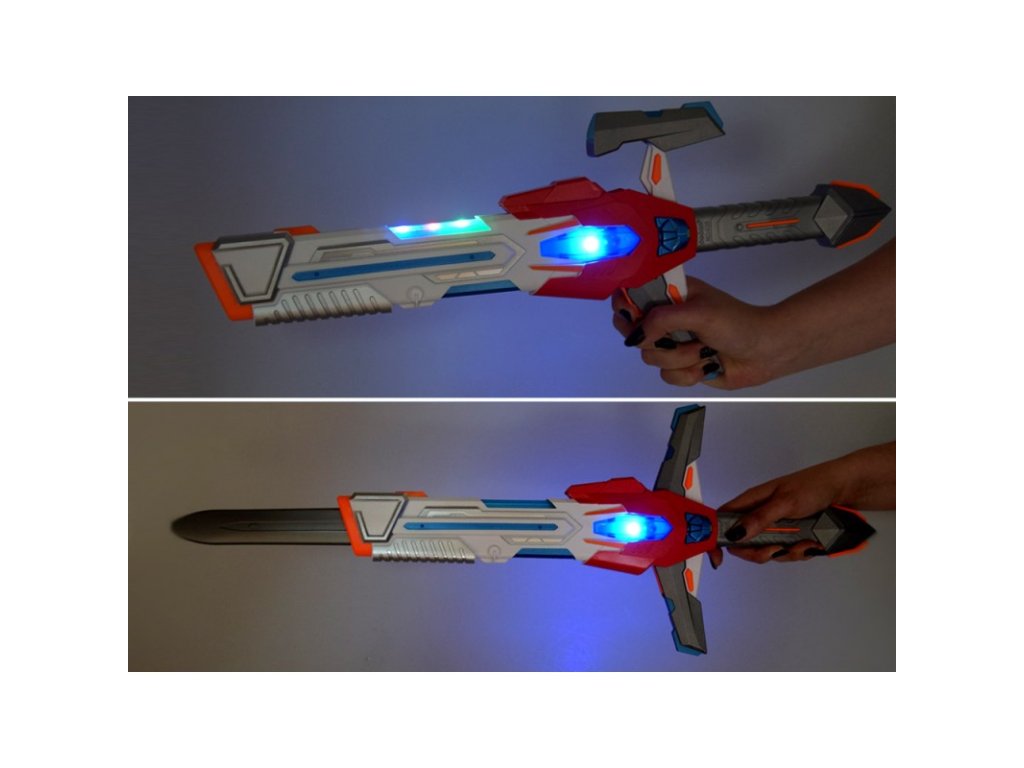 Fantasztikus játék minden fegyverkedvelő számára, aki nem akarja választani, hogy kardot vagy pisztolyt válasszon harc közben. Ennek az innovatív fegyvernek köszönhetően a gyermek mindent egyben kap. A játék néhány egyszerű mozdulattal kardból puskává alakul. A puskától a kardig a játék a fogantyún lévő gomb mozgatásával aktiválható. A szórakozást hangfunkciók (harci hangok, kardcsapások) és villogó fények kísérik a pengében. A funkciók aktiválásához csak mozgassa a kardot. Miután a kardot újra puskává alakítja, a gyerek kap egy futurisztikus puskát. Hogyan lehet kardot puskává alakítani? Könnyű! Csak néhány mozdulat, és egy teljesen más játékot kapsz. Először tolja be a pengét, amíg kattanást nem hall. Ezután megemeljük a fogantyú mozgatható részét, hogy megfelelő rálátást kapjunk fényképezéskor. A második mozgó elem kissé meg van döntve, hogy felfedje a kioldót. A hangfunkciók, azaz a lövések és a villogó fények hangja a ravasz megnyomásakor aktiválódik. A kard visszaszerzéséhez hajtsa össze a fogantyú mozgó részeit, és nyomja meg a robot feje alakú kék gombot a kard pengéjének meghosszabbításához.