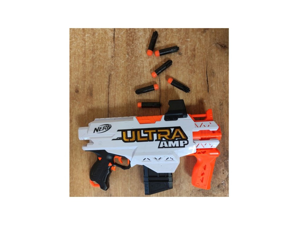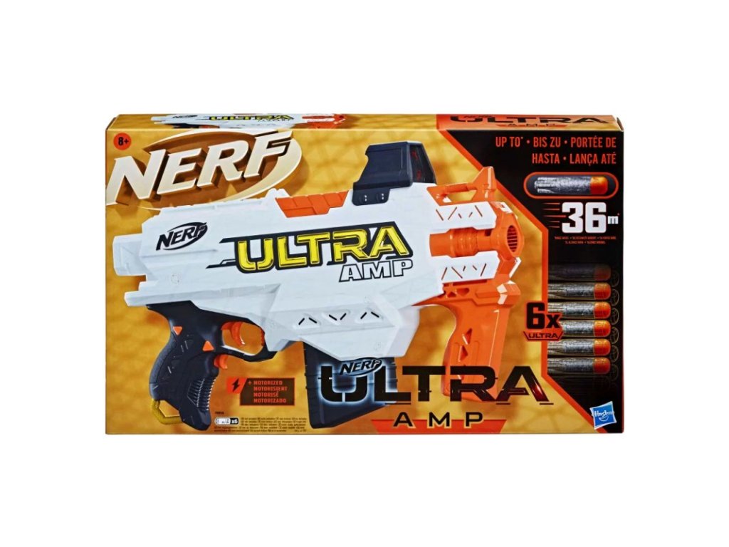 A Hasbro Nerf Blaster Ultra AMP praktikus és könnyen használható. Az Ultra AMP indító automata tár segítségével egyszerre csak egy habszivacsot lő ki. Csak használja az integrált irányzékot, hogy tökéletesen eltalálja a célt. A Blaster intelligens, könnyű és rendkívül könnyen használható. A Nerf Ultra darts segítségével gyors egymásutánban lőhet akár 36 m-es távolságig is! Ezek az egyedülálló dartsok szuperkönnyű Nerf Ultra habból készültek, és innovatív Aerofin technológiával rendelkeznek, amely növeli a hatótávolságukat.