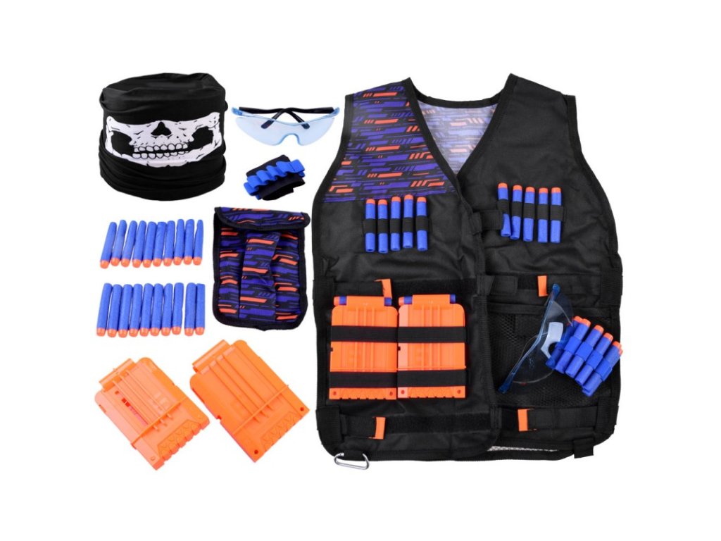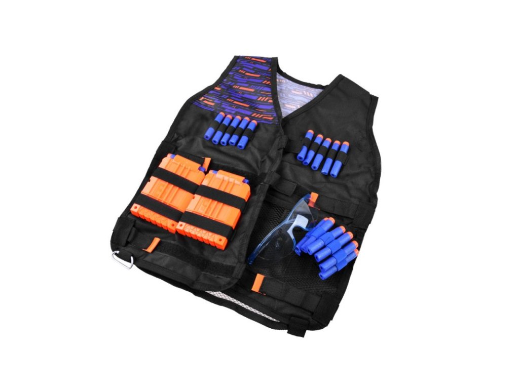 Katonai készlet mellényekkel és töltényekkel a kis harcosnak, sok kerti háború során hasznos. Az univerzális megjelenésnek köszönhetően jó rendőr, bátor katona vagy veszélyes bandita válhat belőled. A készlet tartalmaz 2 db darts adagolót, egy mellényt, egy sálat, egy kivehető zsebet, egy karkötőt nyílásokkal a darts számára és természetesen a dartsot. Itt védőszemüveget is találsz, ami biztonságosabbá teszi a szórakozást. A mellényben vannak zsebek és helyek a további darts számára, aminek köszönhetően kicsinek mindene kéznél lesz, ellenfeleinek pedig esélye sem lesz! A mellény jó minőségű, vastagabb anyagból varrt, és 3 éves kortól alkalmas gyermekek számára. A darts habszivacsból készült, gumi hegyével. A készlet minden kis harcost előnyhöz juttat a csatatéren. Tökéletes ajándék lehet azoknak a gyerekeknek, akik szeretik a csatákkal és háborúkkal kapcsolatos játékokat, vagy kiegészítik a rendőrségi vagy katonai témájú játékokat. Hasznos lesz jelmezkiegészítőként is mindenféle iskolai rendezvényen, színházban, színdarabon vagy karneválon.
