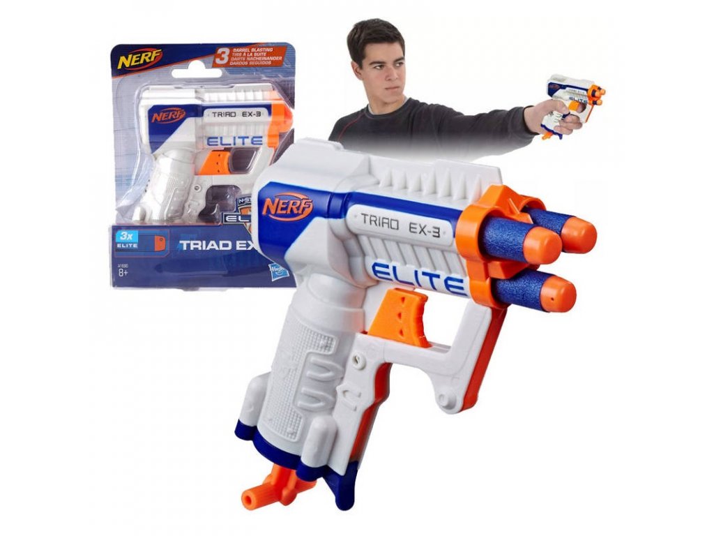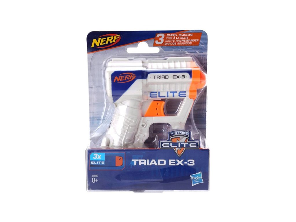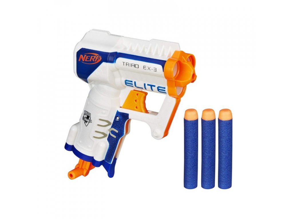 A Nerf N-Strike Elite Traid Ex-3 egy praktikus, kisebb méretű habágyú, amely nem csak lövöldözésre, hanem az ellenség üldözésére is alkalmas! A kompakt méretű, három habdarttal felszerelt fegyver 27 méteres távolságig elegendő tűzerőt biztosít. A darts puha habszivacsból készült, gumi hegyével.