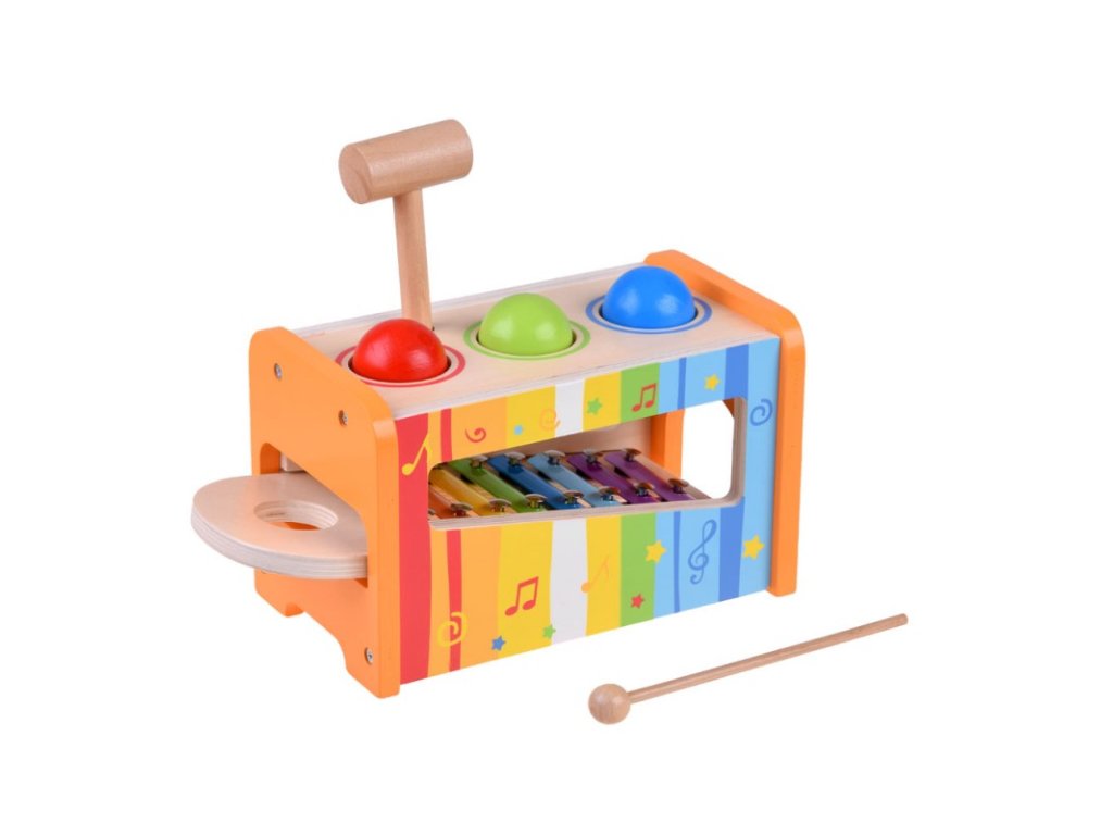 Fantasztikus 2 az 1-ben játék, amely minden gyermeket lenyűgöz, és sok órányi kreatív szórakozást biztosít. A játék jótékony hatással van a hallásra, a zenei érzékenységre, valamint a ritmusra és a szem-kéz koordinációra. Lehetővé teszi a gyermekek számára, hogy megismerjék az okok és következmények sorrendjét. Miért 2 az 1-ben A válasz egyszerű. A gyermek egyrészt hagyományos cintányérokat kap, amelyeknek köszönhetően megtanulhatja a skála hangjait és a zenén keresztül fejezheti ki magát, másrészt a játékot a cintányérok fölé helyezett kalapáccsal látják el. Egy kisgyermek biztonságos kalapáccsal ütheti a labdákat, a cintányérokat ütő labdák pedig fülnek kellemes hangokat adnak.
