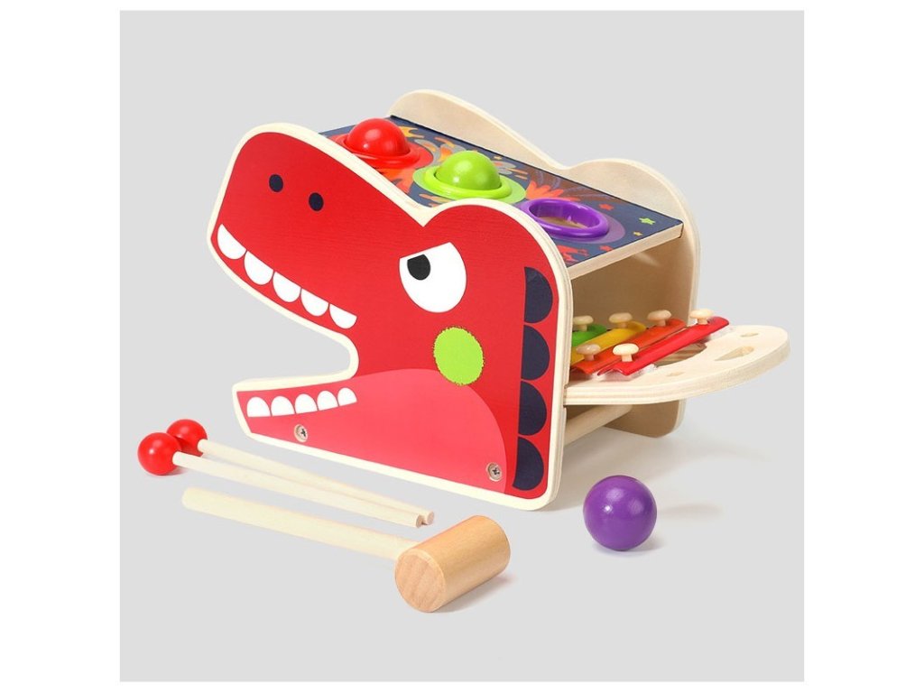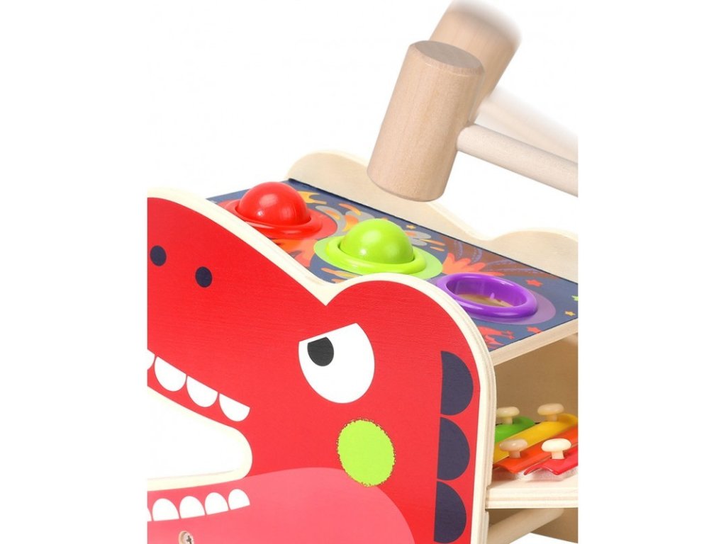 A színes fa T-Rex kalapáccsal és xilofonnal remek játék nem csak a dinoszauruszok szerelmeseinek, hanem a sok energiával rendelkező gyerekeknek is.