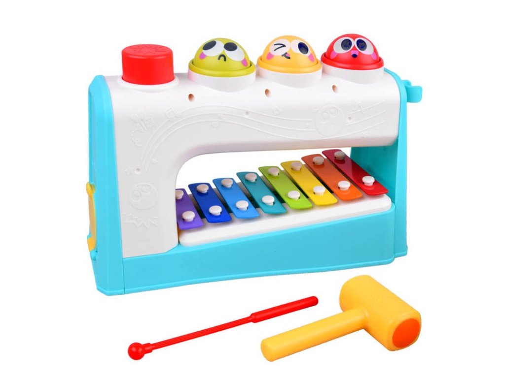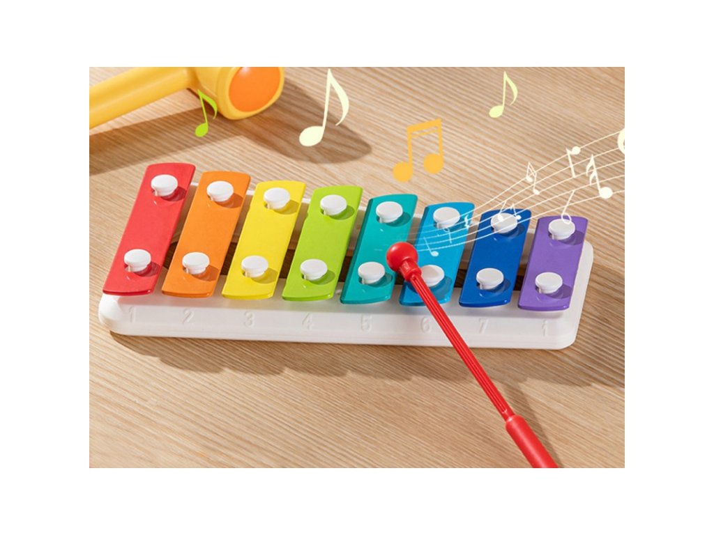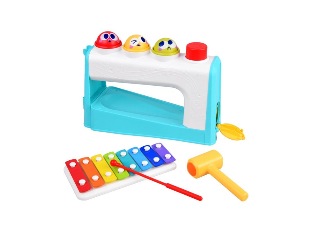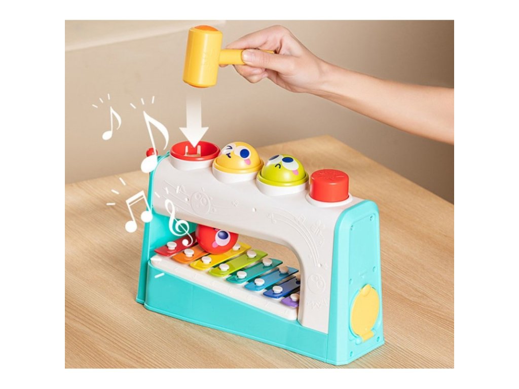 Fantasztikus 2 az 1-ben játék, amely minden gyermeket lenyűgöz, és sok órányi kreatív szórakozást biztosít. A játék jótékony hatással van a hallásra, a zenei érzékenységre, valamint a ritmusra és a szem-kéz koordinációra. Lehetővé teszi a gyermekek számára, hogy megismerjék az okok és következmények sorrendjét. Miért 2 az 1-ben A válasz egyszerű. A gyermek egyrészt hagyományos cintányérokat kap, amelyeknek köszönhetően megtanulhatja a skála hangjait, és zenén keresztül fejezheti ki magát. Ezenkívül a játék egy kalapáccsal van felszerelve, amely a cintányérok felett található. Egy kisgyermek biztonságos kalapáccsal ütheti a labdákat, a cintányérokat ütő labdák pedig fülnek kellemes hangokat adnak. De ez nem minden! A gömblyukak mellett egy titokzatos piros gomb található. Csak nyomja meg és tartsa lenyomva, és a labda felemelkedik, és visszamegy a cintányérok elejére, majd leereszkedik, és ismét hangokat ad ki, miközben leesik a xilofonon az alján lévő lyuk felé. Végtelen szórakozás! Ha ki akarja húzni a labdát a játékból, csak nyissa ki az oldalán lévő sárga kerek ajtót.
