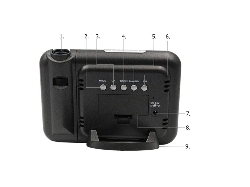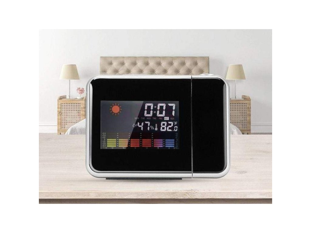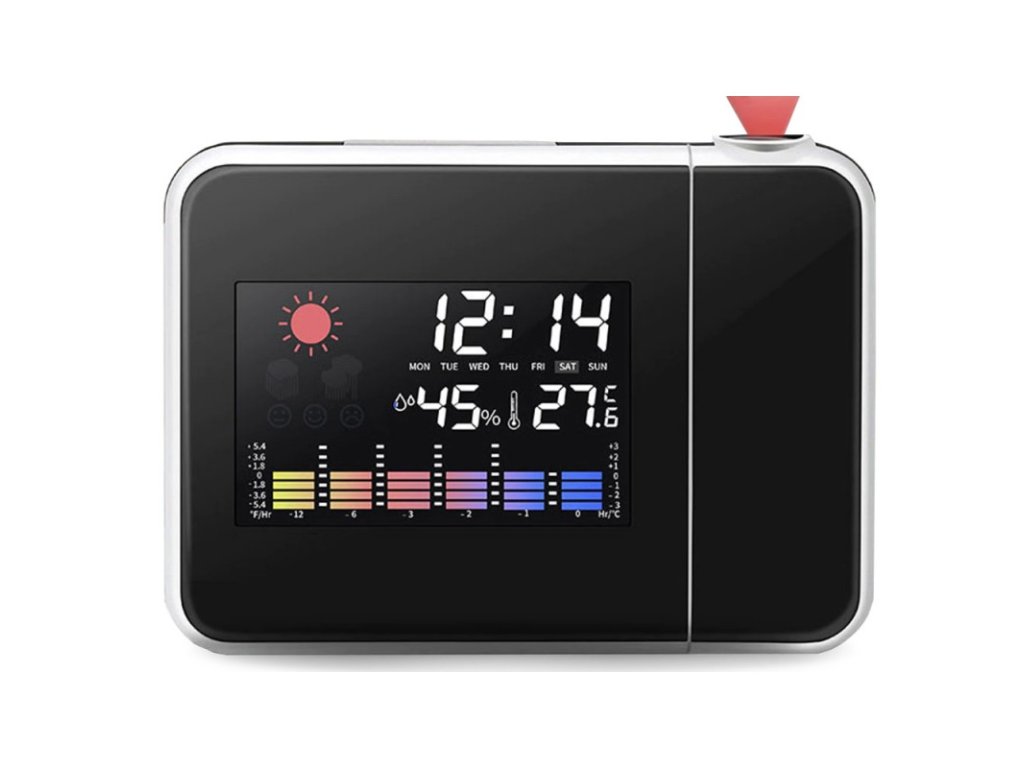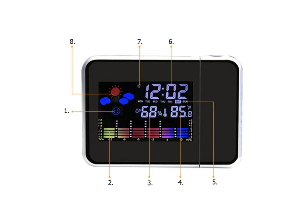 - Ráadásul az idő a falon vagy a mennyezeten is megjeleníthető az állítható projektor használatának köszönhetően, amely teljes sötétségben is tökéletesen láthatóvá teszi.