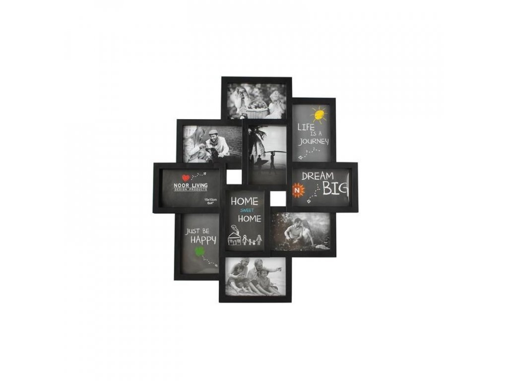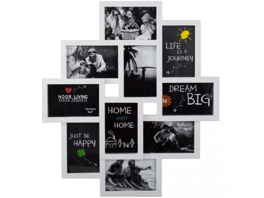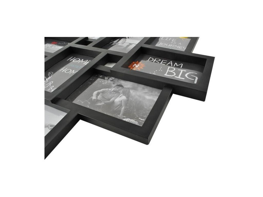 A keret 10 egymáshoz illesztett téglalap alakú keretből áll, és legfeljebb 10x15 cm-es (látható 9x14 cm-es) fényképeket rendez. Ez az egyik szabványos fotóméret, így nem kell levágni őket, ha így hívták őket elő. 6 keretet vízszintesen és 4 függőlegesen helyeztek el, és az egészet érdekes, aszimmetrikus térelrendezésbe hajtották össze. A keret funkciója praktikus, mert a fotók kombinációjának köszönhetően helyet takarít meg otthon. A dekorációval könnyedén felakaszthat vagy egy helyre helyezhet néhány fényképet különösebb erőfeszítés nélkül. A fényképek elrendezése érdekes dekorációs hatást kölcsönöz. A keret különleges karaktert ad a helyiségnek, és felejthetetlen varázst ad nekik. Ez egy szép belső kialakítás.