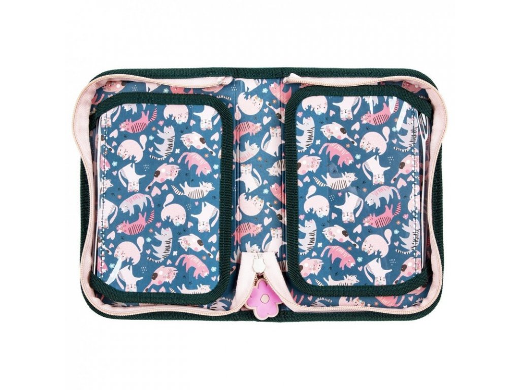 Vidám és színes díszítésével ez a tolltartó minden korosztály számára felkelti a gyerekek figyelmét. A dizájn karaktereket, állatokat, élénk színeket vagy játékos mintákat tartalmazhat, így nem csak hasznos eszköz, hanem szórakoztató kiegészítője is lehet a gyerekkészletnek. A tolltartó egy cipzáras rekesszel és két belső oldallal rendelkezik. A cipzár díszítéssel van befejezve. A tolltartó belsejében fülek találhatók a tartozékok számára, valamint hely egy óratervnek és egy szorzótáblának. A tolltartó tartozék nélkül van.