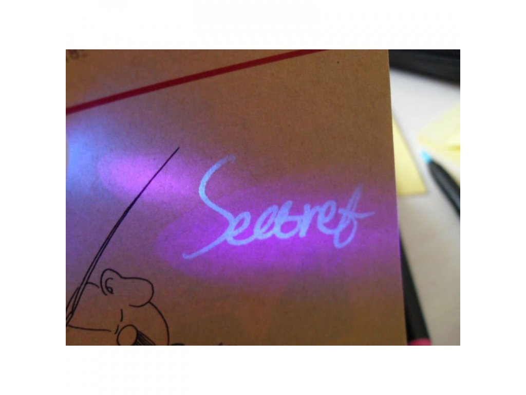 Ez az eredeti toll tetszeni fog a kis kémeknek, de a diákoknak is. A toll tele van tintával, amely csak UV fényben látható. Csak írj valamit tollal, majd világíts UV lámpával a feliratra, és a szöveg azonnal olvasható.