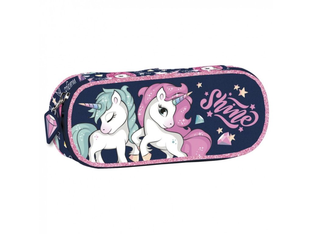 Hurrá iskolapadba! A tolltartó látványa annyira felvidít, hogy hirtelen megfeledkezik az iskolai rutinról és a hétköznapokról. Nem számít, hogy tollat, ceruzát vagy jelölőt használsz, ez a tolltartó mindenre készen áll. Egyszerű és intuitív kialakításának köszönhetően tolltartónk használata gyerekjáték. Csak helyezze be a tollat, nyomja meg és kész! Egykamrás merevített tolltartó egy cipzárral és dekoratív medállal, melynek belseje teljesen bélelt. Belső oldalán egy 5 írószer tárolására alkalmas gumiszalag és egy cipzáras hálós zseb található.