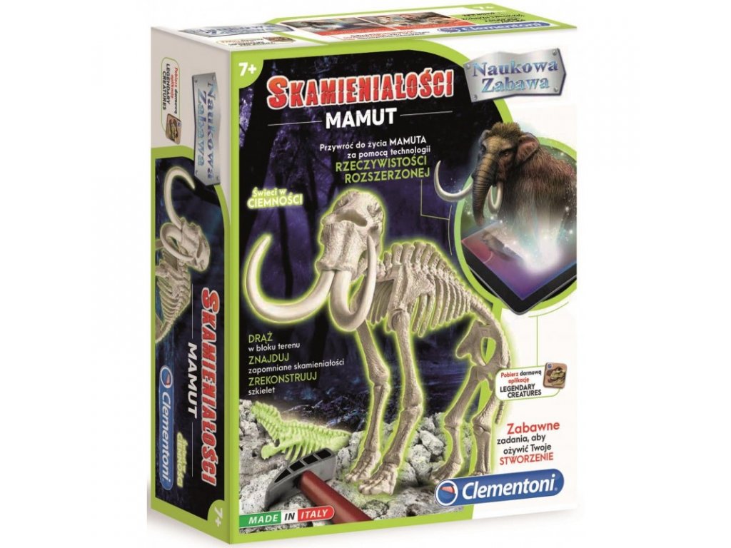 Csatlakozz a világ leghíresebb felfedezőihez! Vegyen részt a csontvázak feltárásában és a történelem előtti világ rejtélyeinek felfedezésében. Ez a készlet egy foszforeszkáló mamutvázat tartalmaz, amelyet paleontológiai eszközökkel kell kinyerni a tereptömbből. A keret több részből áll, amelyek könnyen összeszerelhetők további szerszámok használata nélkül. Ezenkívül a készlet lehetővé teszi, hogy az alkalmazás segítségével újra életre keltse a mamutot.