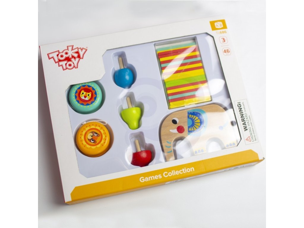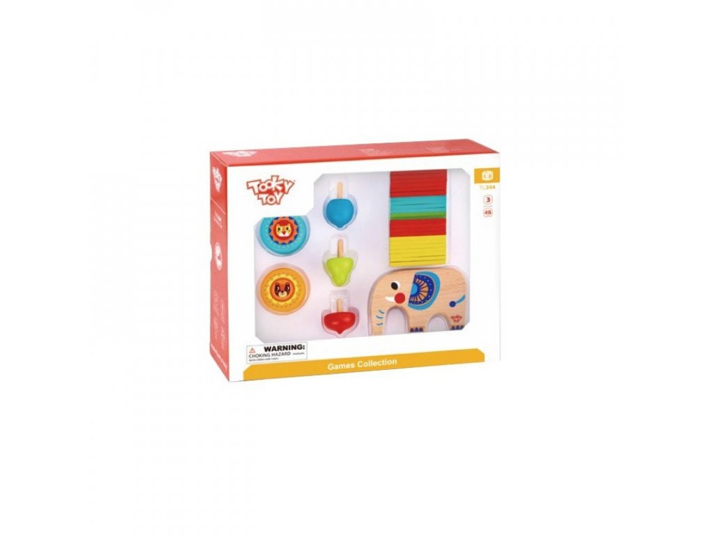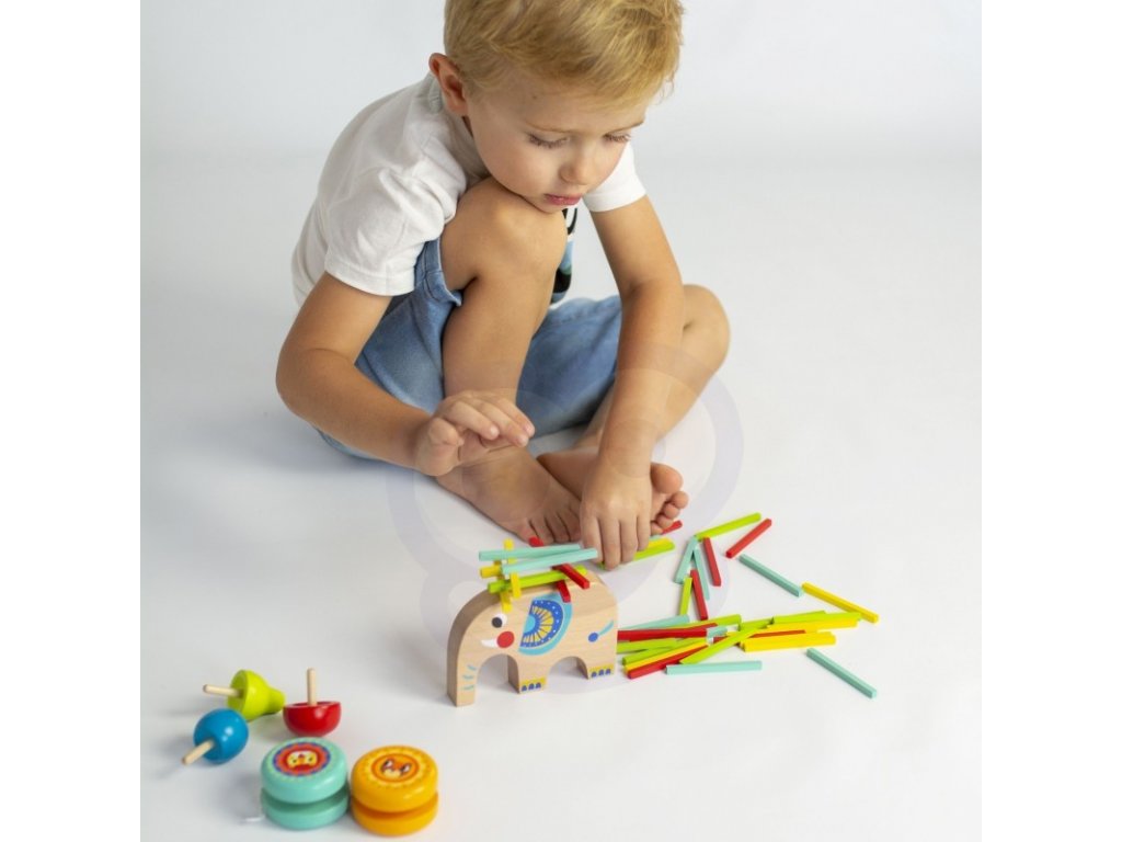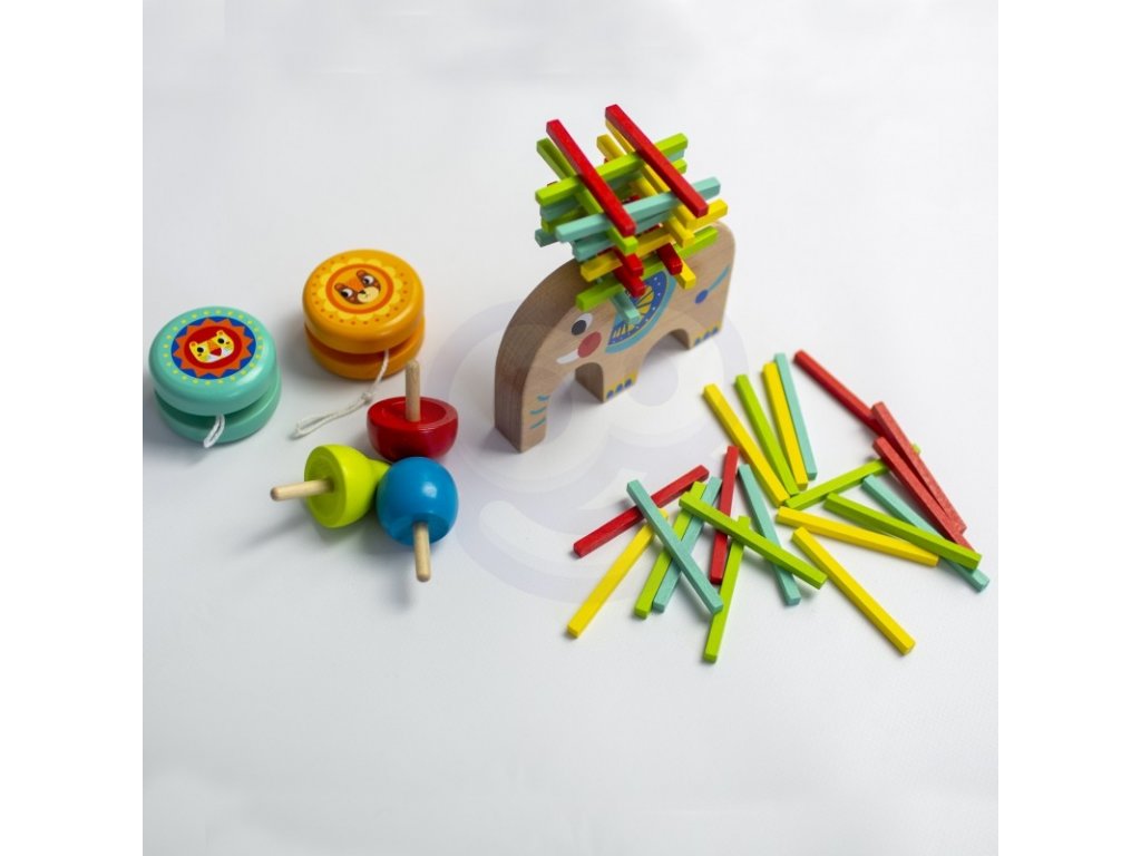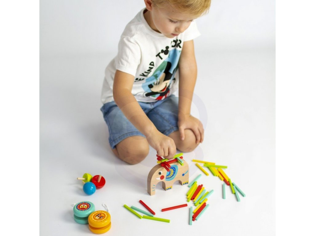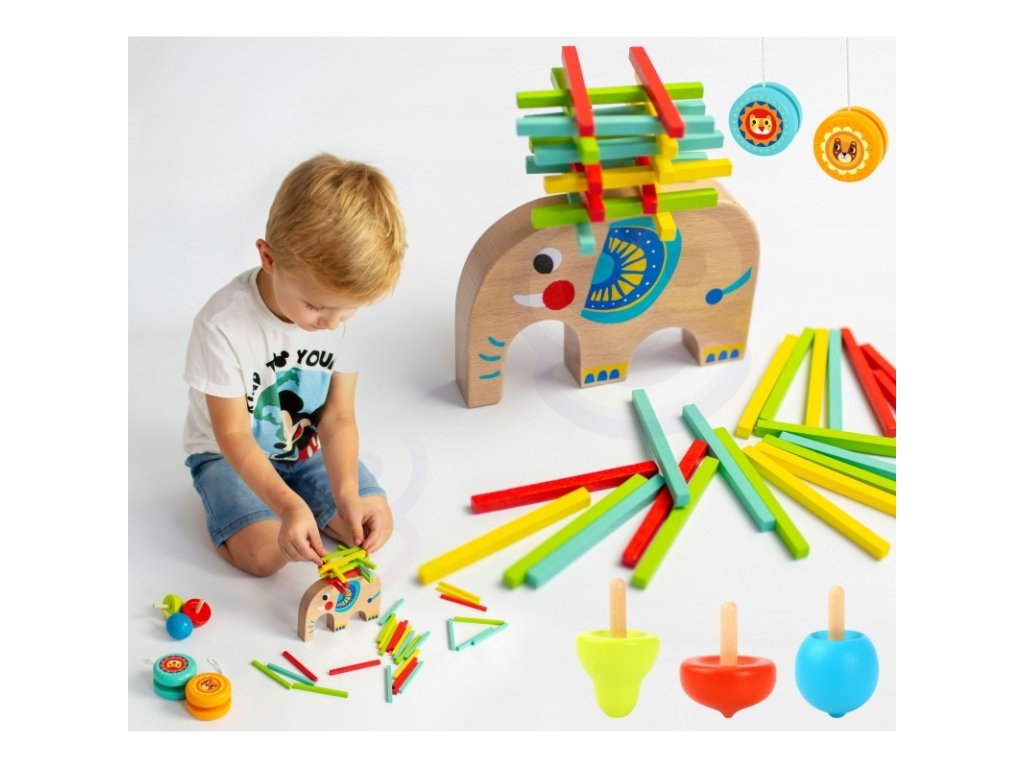 Ez a fából készült játékkészlet egyedülálló a neves Tooky Toy fajáték márkától, amely magával ragadja a gyerekeket, és soha többé nem hagyja unatkozni. Egy aranyos elefánt alapja lehet egyensúlyozó torony építésének, vagy egy gyermek kerítést építhet hosszúkás darabokból. A hosszúkás darabok lehetővé teszik a gyermek számára a kézi pontosság és a szem-kéz koordináció edzését. Ezenkívül a készlet két jojót tartalmaz, amelyek segítségével a gyermek új trükköket próbálhat ki, és ezáltal fejlesztheti képességeit. Ha a gyerek abbahagyja a jojózást, versenyezhet a forgó kúpokkal. Pörgesse meg mind a hármat, és nézze meg, melyik tart a legtovább! A készlet minőségi anyagokból készült, így biztonságos a gyermekek és a környezet számára.