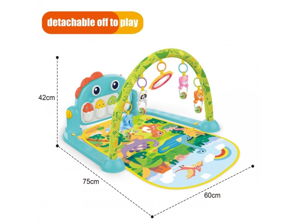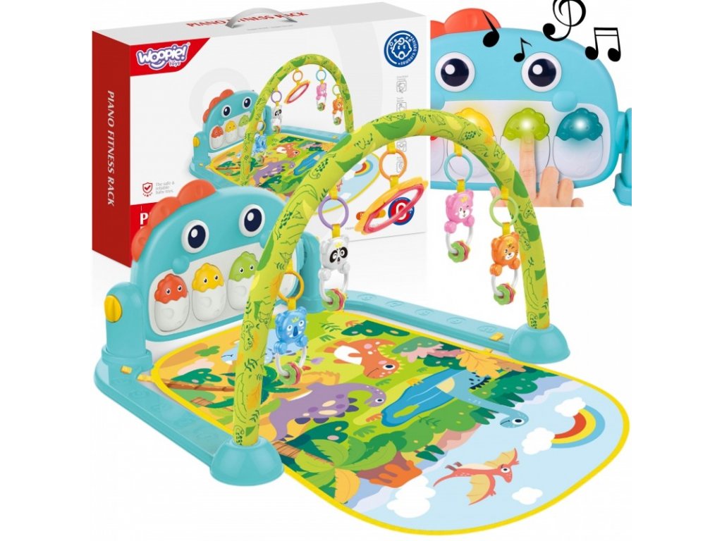 A Woopie márka Dino padja egy olyan játék, amelyet születéstől fogva gyermekek számára terveztek. A szőnyegen színes, állati formájú medálokkal és tükörrel ellátott kapu, valamint csúszó kerekek találhatók, mely kedvezően hat a baba minden érzékszervének fejlődésére. Matracunk remek hely a kikapcsolódásra, szórakozásra és a világ felfedezésére. A szórakozást egy panel dinoszaurusztojással és kellemes dallamokkal teszi kellemesebbé.
