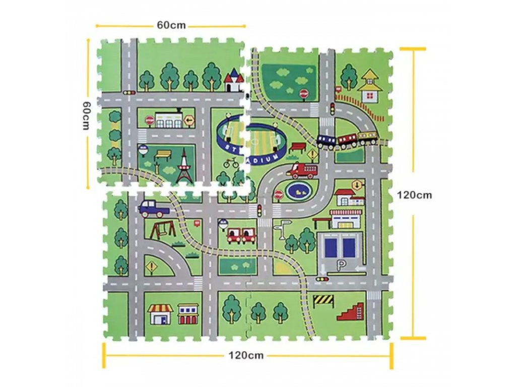 A rejtvények további előnye a város útitervének érdekes és vidám motívuma, amely a gyerekek fantáziáját és kognitív képességeit is fejleszti. A kisgyermek saját jeleneteket készíthet majd, amelyek megjelenhetnek a forgalomban. A motívumok között különféle járműveket, kereszteződéseket, vasúti átjárókat és gyalogátkelőhelyeket találunk. A habszivacs puzzle szőnyegként a padlóra fektethető, így egy puha, 120 x 120 cm-es szőnyeg keletkezik, amely véd a hidegtől. A gyerekek rájuk teríthetik játékaikat, és játszhatnak vagy könyveket olvashatnak. A kisebb gyerekek is szundíthatnak egyet a szőnyegen, megtanulhatnak kúszni vagy megtehetik első lépéseiket. Gyermeke felfedezi és megismeri a különböző járműveket és helyzeteket az úton, valamint a városi életet. A találós kérdések nem csak szórakozást nyújtanak, hanem a közlekedésbiztonság alapvető szabályait is megtanítják – például játékokkal játszva jeleneteket. A habszivacs rejtvények nem csak a kisgyermek kézügyességét fejlesztik, hanem életkorának megfelelő módon bevezetik a közúti közlekedés világába is. Mindegyik puzzle elég vastag és puha ahhoz, hogy biztonságos és kényelmes játékteret biztosítson. Maga az anyag kopásálló, nyomástól függetlenül megőrzi formáját és megjelenését. A felhasznált anyagnak köszönhetően csökkenti a rezgéseket és csillapítja a hangot. A kirakószőnyeg könnyen tárolható, mert az elemek könnyen össze- és szétszedhetők. A habszivacs kirakósok gyönyörű színekben és gyönyörű mintázatúak, a játék biztosan felkelti majd gyermeke érdeklődését és sokáig szolgálja kicsitől a nagyig.