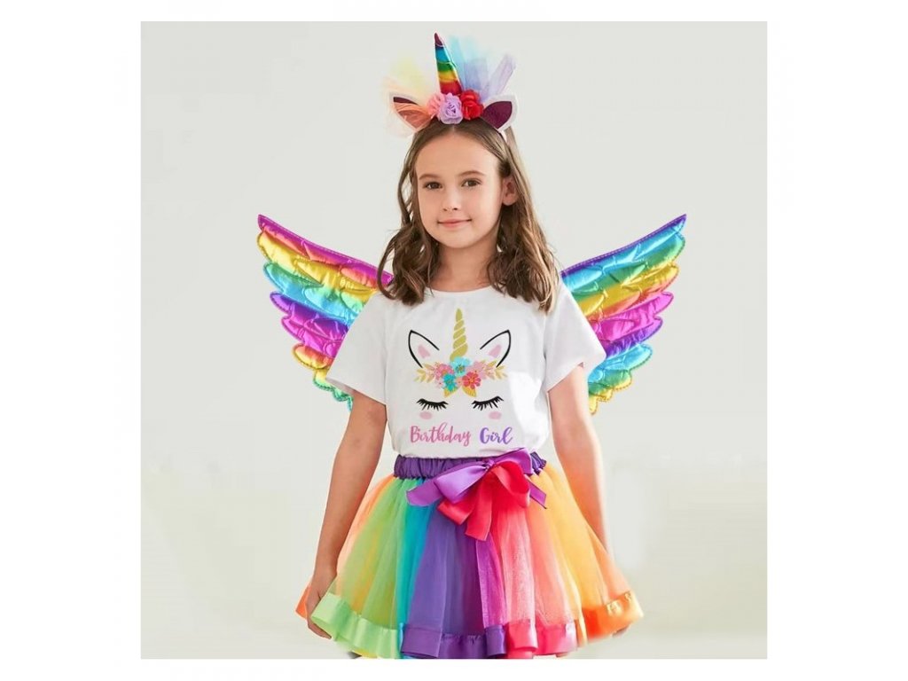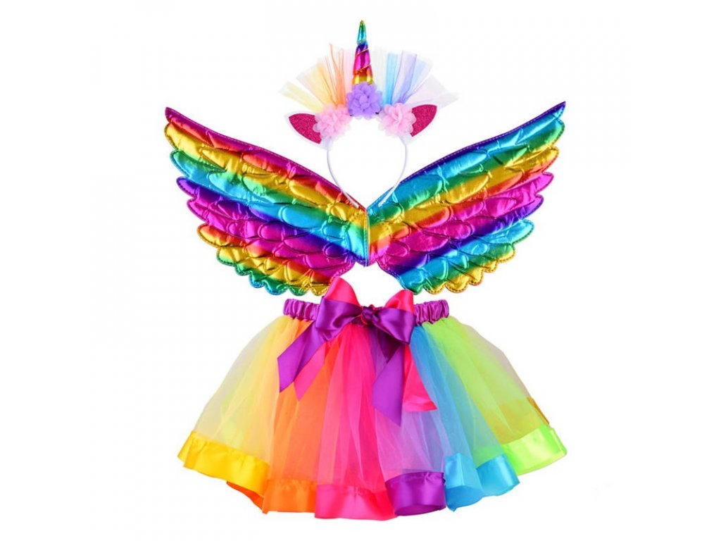 A komplett unikornis jelmez minden kislányt megörvendeztet, aki szeret mesefigurának öltözni. A készlet egy mesés színű fodros szoknyából áll, amely széles színes szalaggal bélelt. A szivárványos szoknya elöl gumírozott és dekoratív masnival rendelkezik. Egy másik kötelező tulajdonság a varázslatosan csillogó szárnyak, amelyekkel minden tündér rendelkezik. A szárnyak steppelt anyagból készültek, így remekül mutatnak a kis tündér hátán, a pántok pedig rugalmas gumiszalagból készültek, ami garantálja a tökéletes illeszkedést. Az utolsó kötelező tündér attribútum a színes unikornis szarv fejpánt, ahol a tündér varázslatos egyszarvúvá változhat. Az egész készlet gyönyörűen fog kinézni egy jelmezes bulin, egy óvodai előadáson vagy csak gyermeke mindennapi játéka közben.