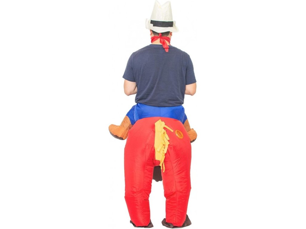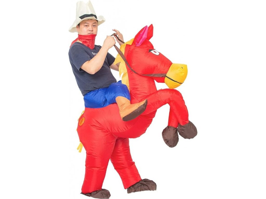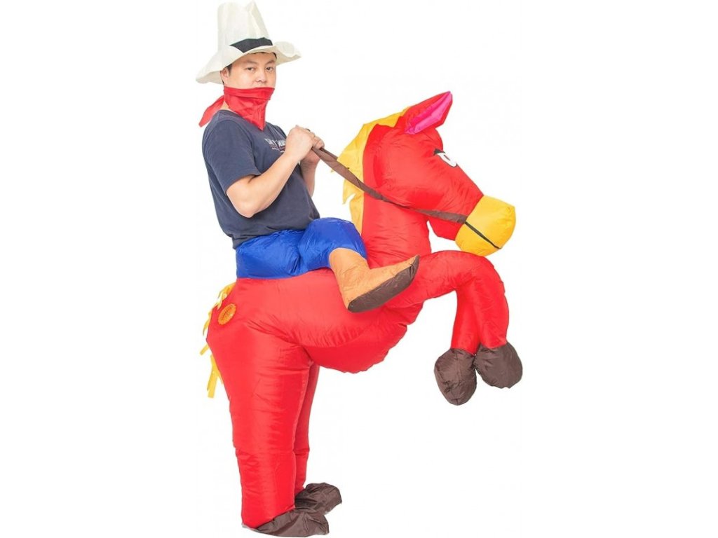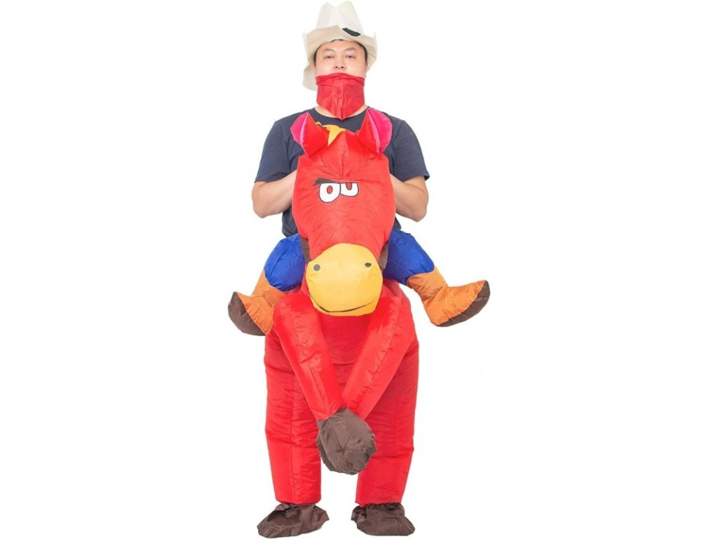A levegővel felfújó tűzlovas vicces jelmeze Halloween-partira, karneválra vagy tematikus bulira is alkalmas, de akár gyerekeknek is szórakoztató programot vagy humoros színházi előadást készíthet vele.