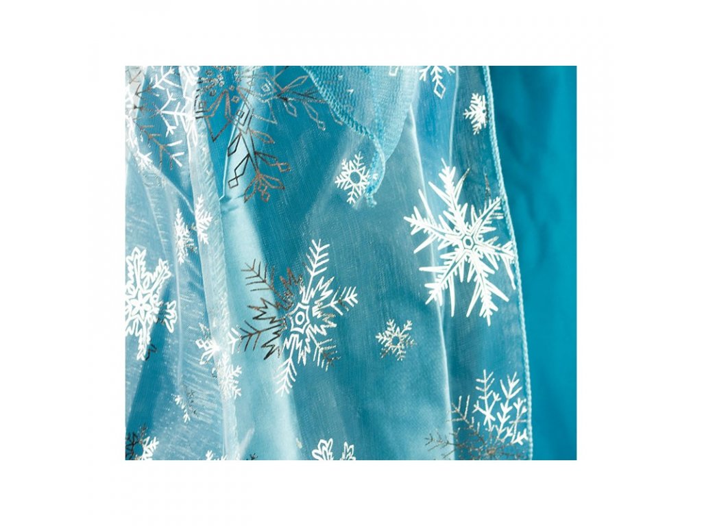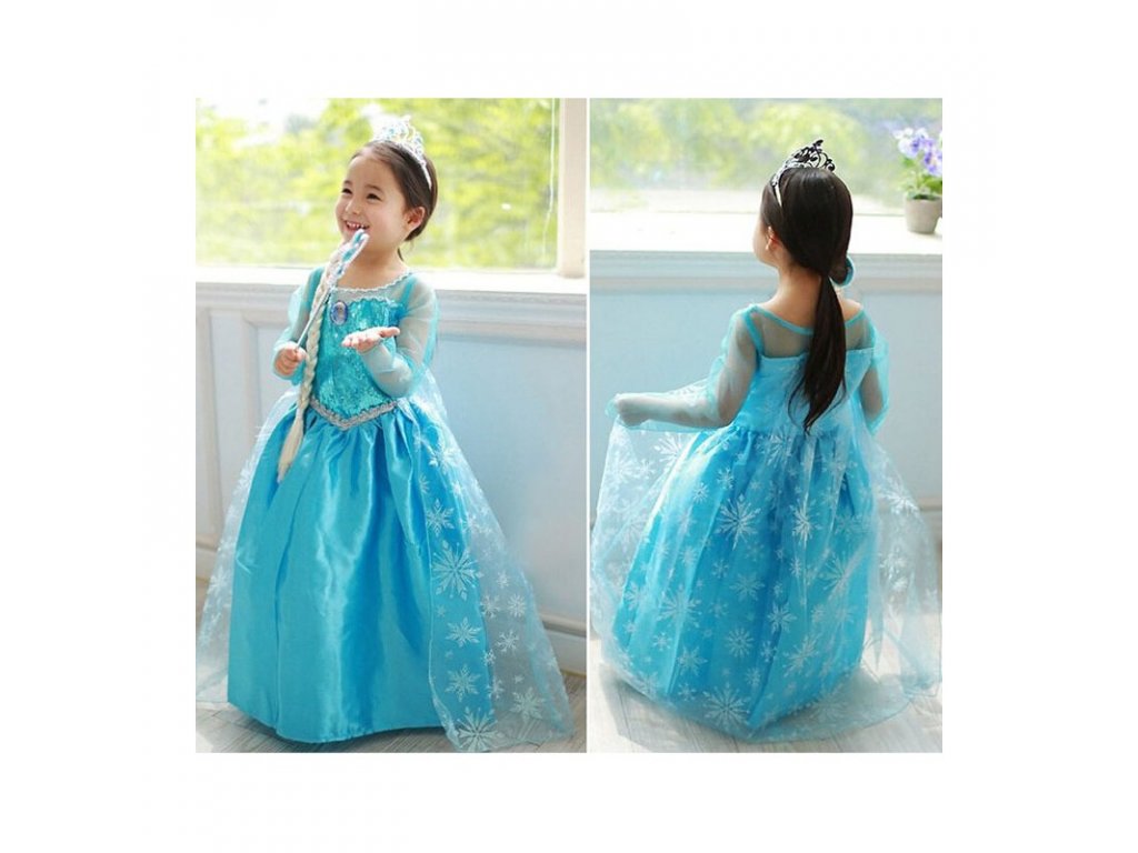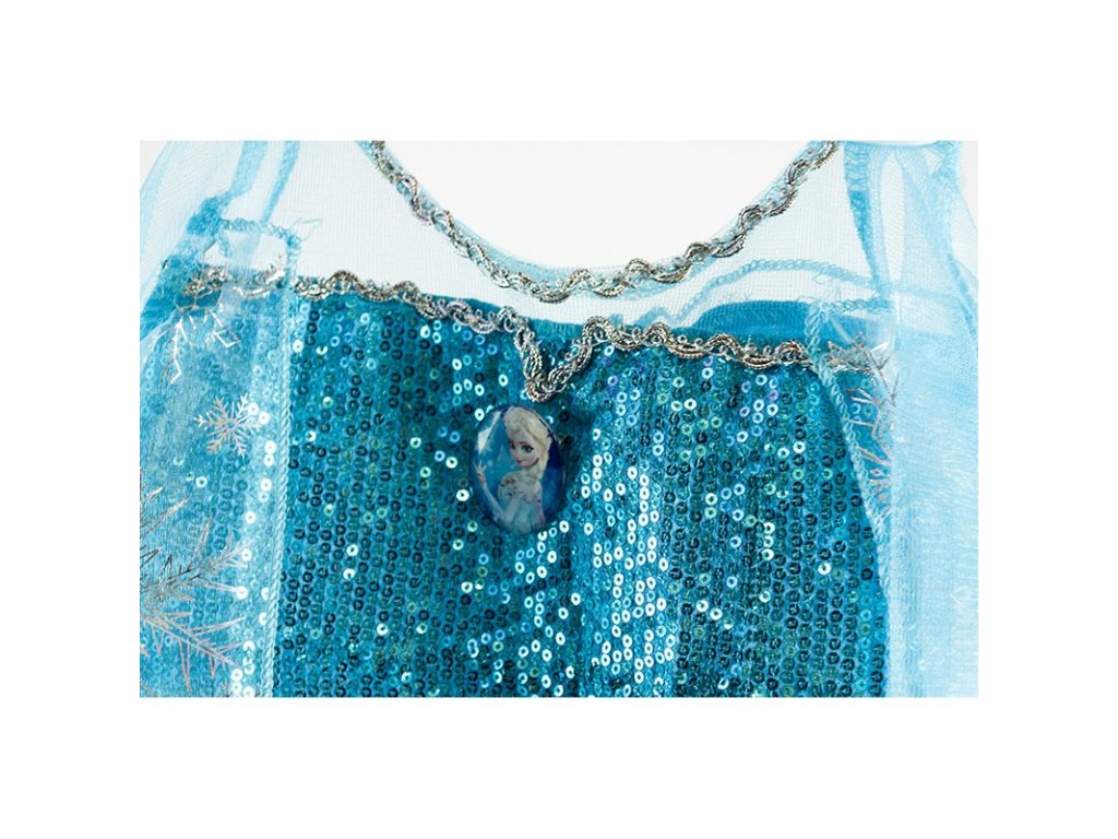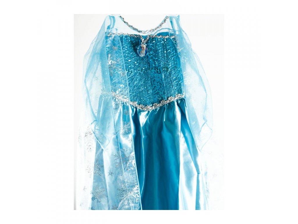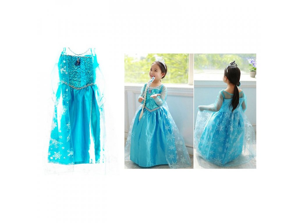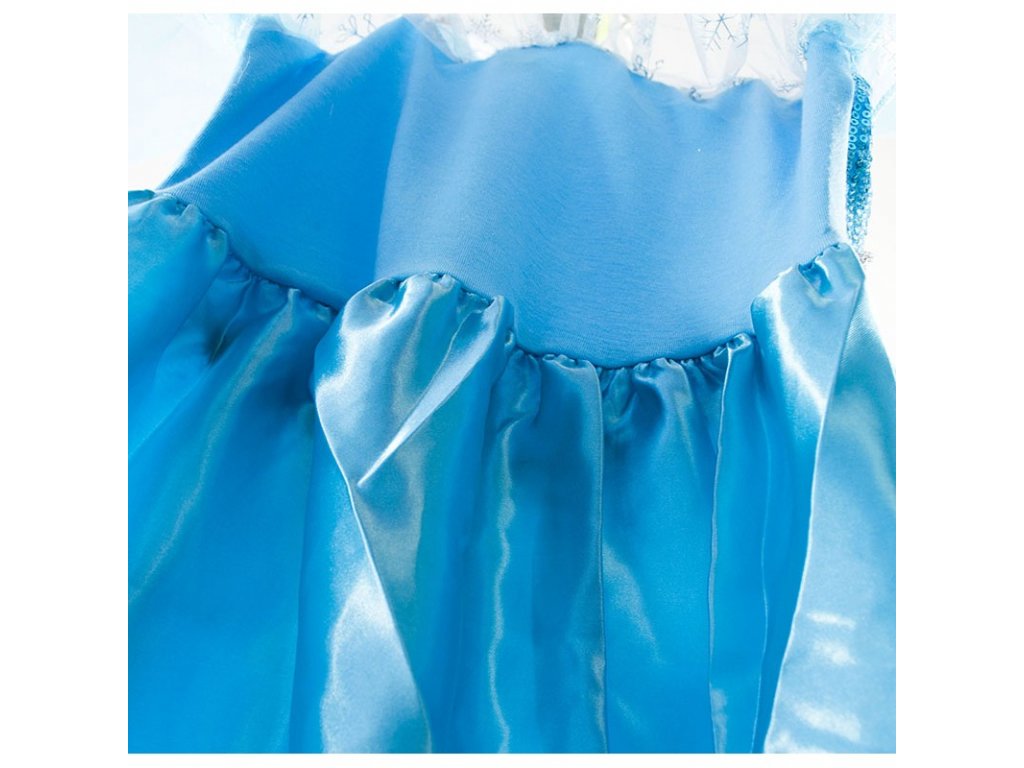 Az Elsa hercegnőre emlékeztető kék, farsangi ruha erős poliészterből és rugalmas pamutból készült. A ruha felső, elülső részét flitter borítja. A ruhához Elza királynő képével ellátott bross kapcsolódik, a bross lecsatolható. A ruha hátulján hópehely mintákkal díszített áttetsző köpeny található. Ideális minden farsangi partihoz és tematikus születésnapi partihoz.