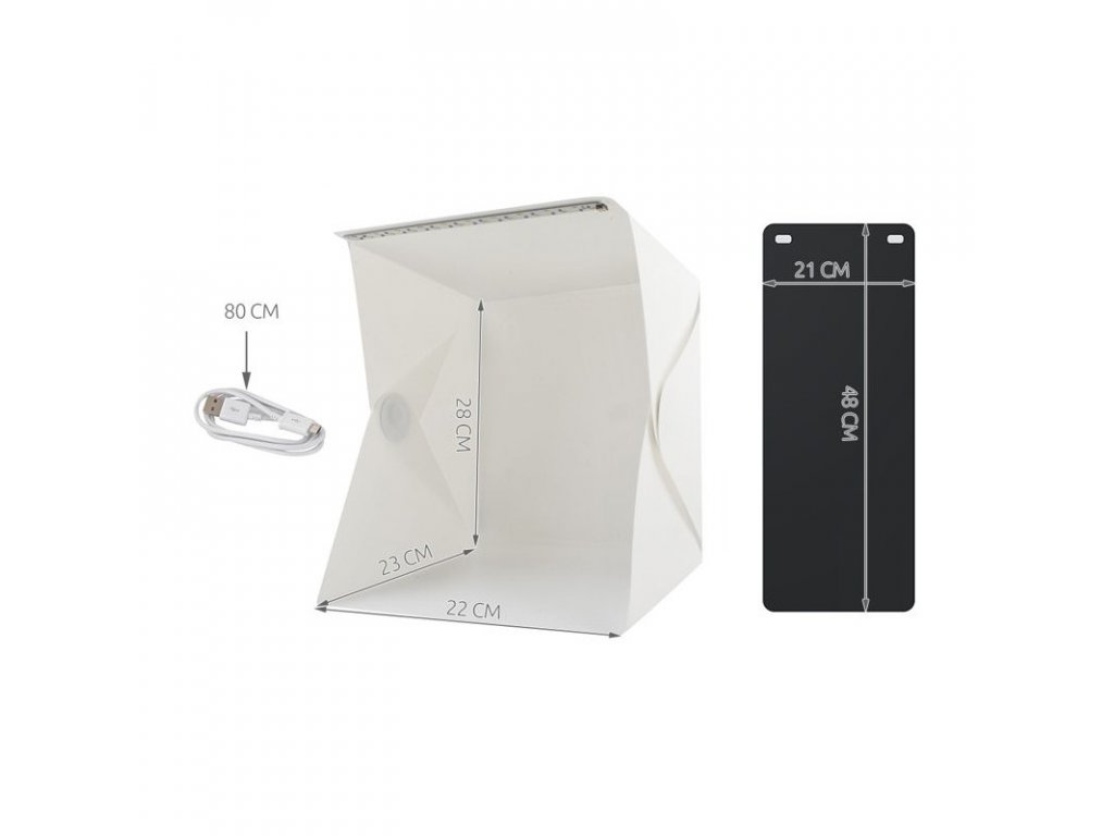 A diffúziós sátor ideális kis tárgyak, például ékszerek, órák, kozmetikumok vagy gyűjthető tárgyak fényképezésére. Előnye a gyors, egyszerű össze- és szétszerelés, valamint a kis méretek összecsukva. Az egyenletes megvilágítás érdekében LED szalaggal érkezik, amely USB-n keresztül bárhová csatlakoztatható. A csomag fekete-fehér cserélhető háttereket is tartalmaz.