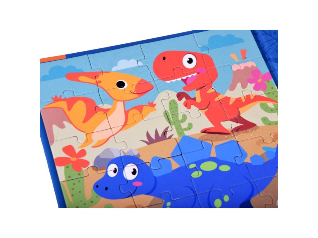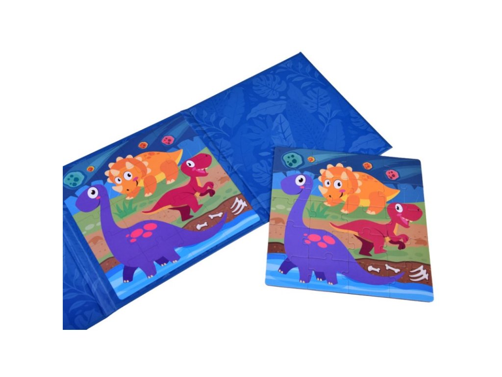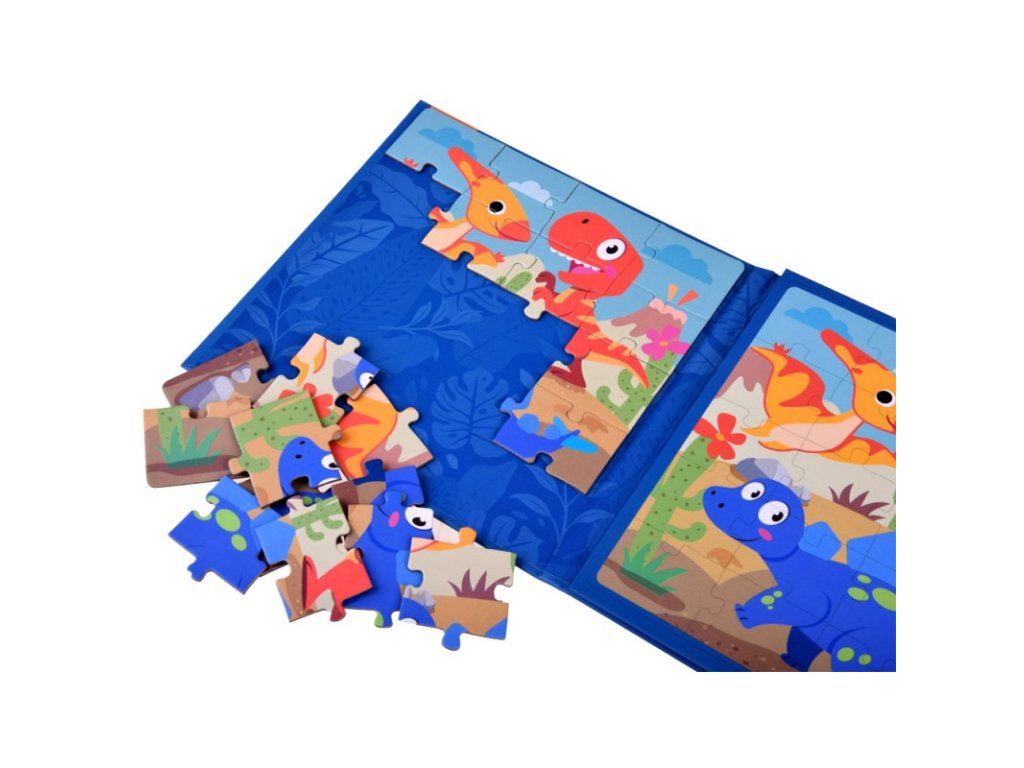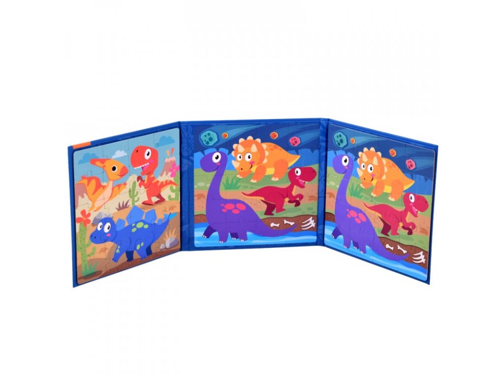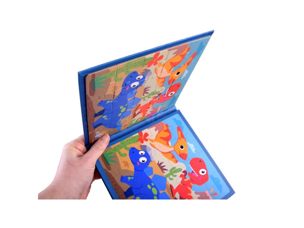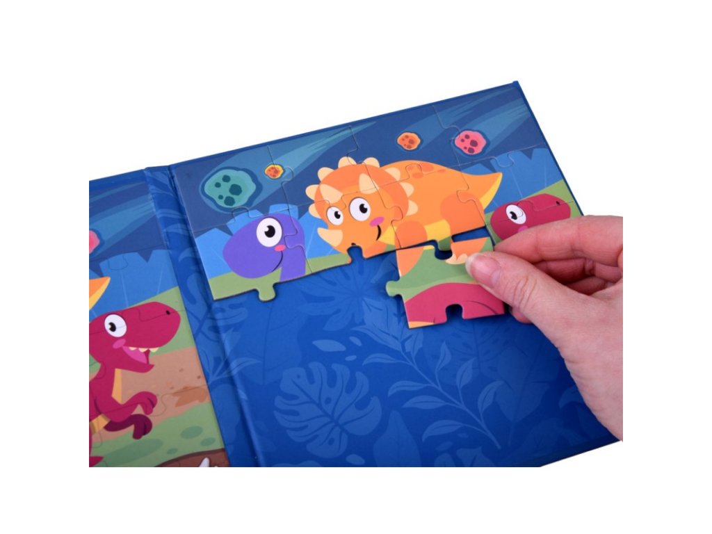 A színes mágneses puzzle őskori dinoszauruszokkal, könyv formájában, remek ötlet ajándéknak minden kíváncsi gyerek számára.