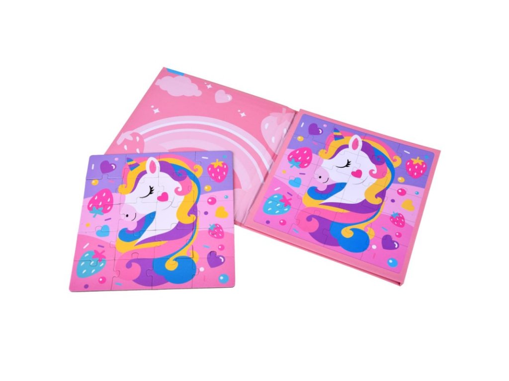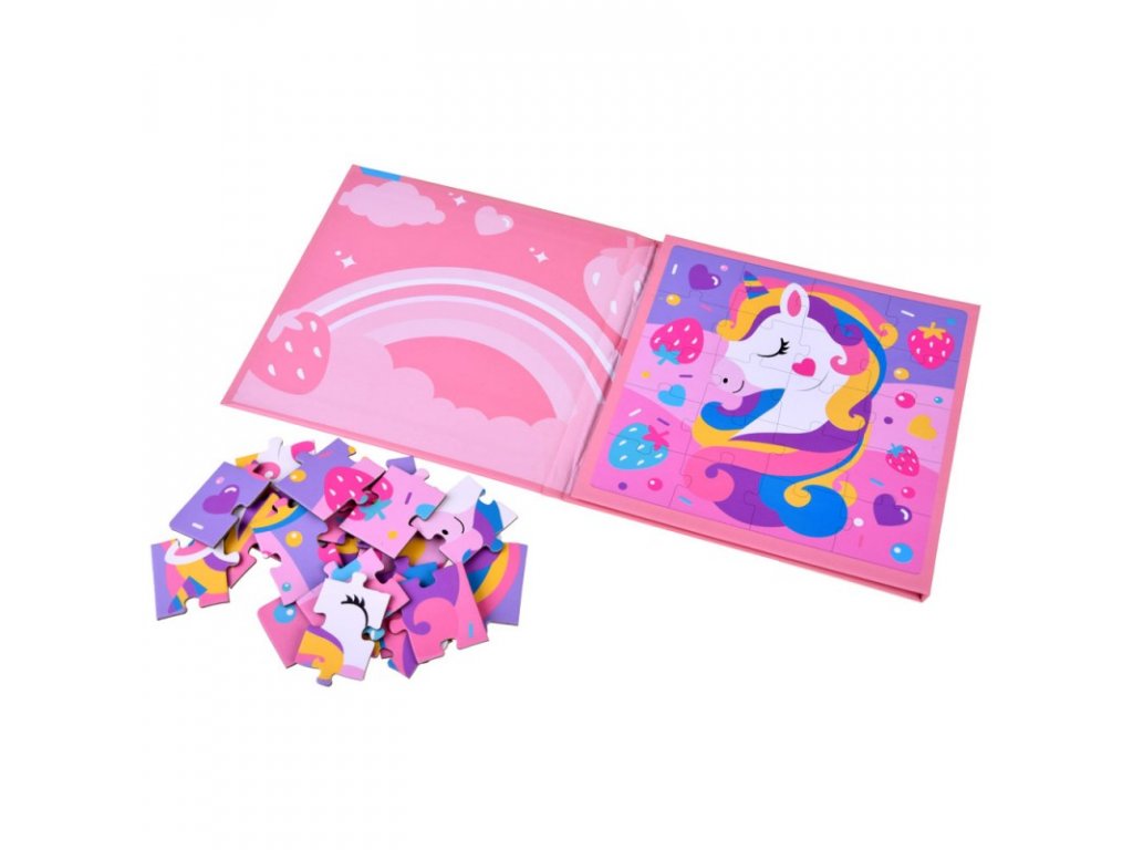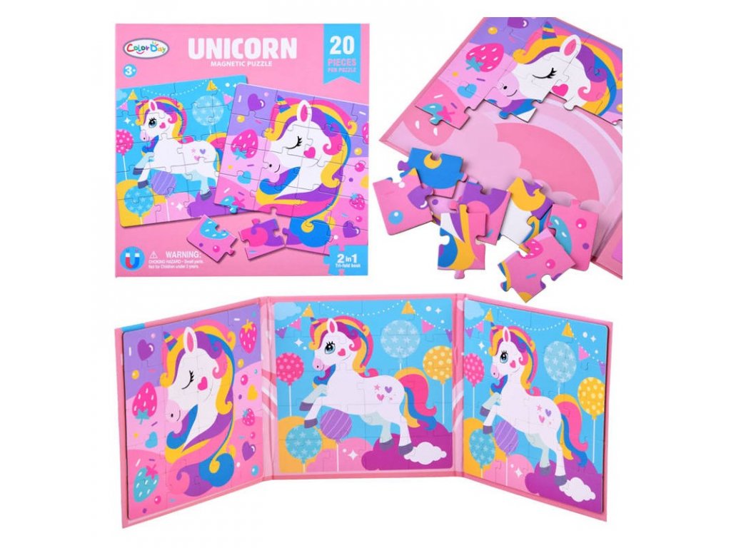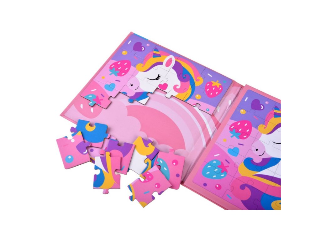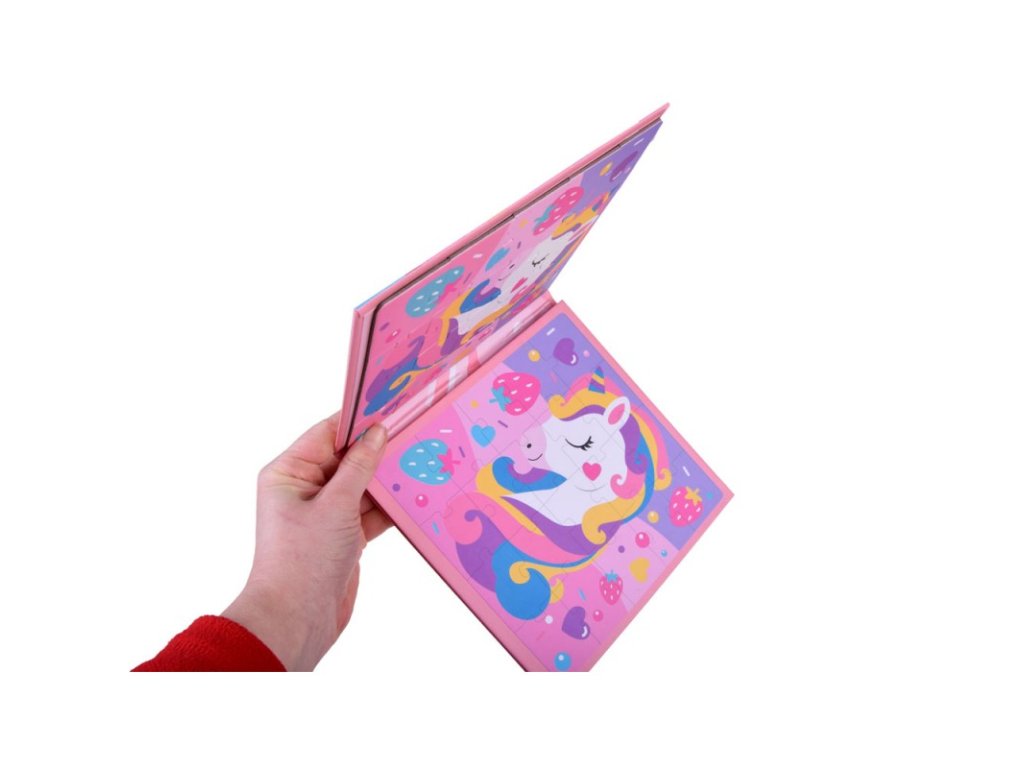 A színes mágneses puzzle varázslatos unikornisokkal, könyv formájában, remek ötlet ajándéknak minden kíváncsi gyermek számára.