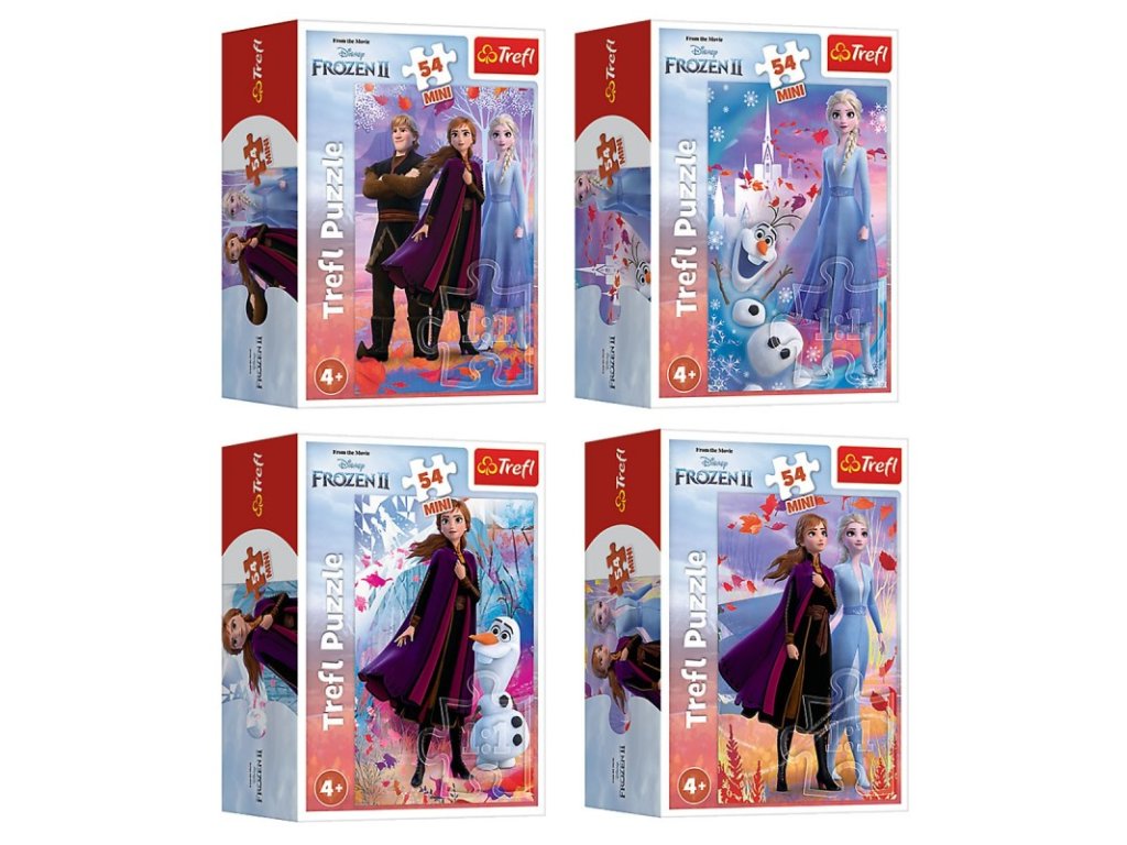 4 db puzzle kis praktikus dobozokban, melyek könnyedén elférnek a gyerek hátizsákjában és a játékpolcban. Minden puzzle egy másik kép, amely 54 darabból áll. Az összerakás után a gyerekek gyönyörű képeket varázsolnak kedvenc szereplőikkel az adott képről.