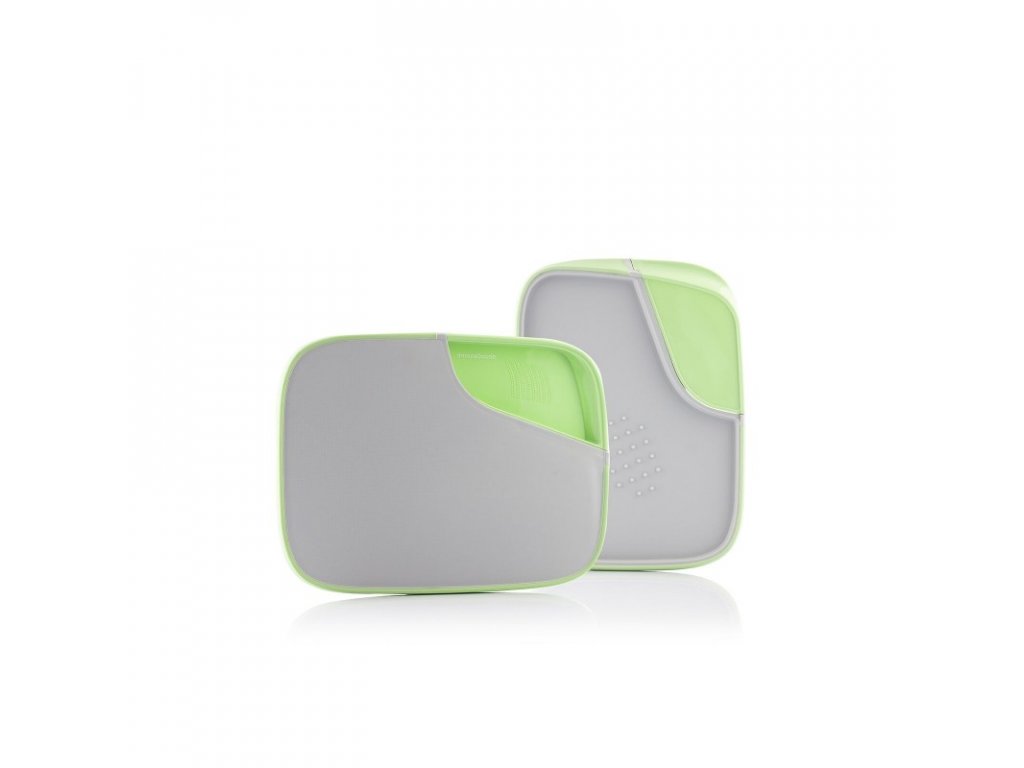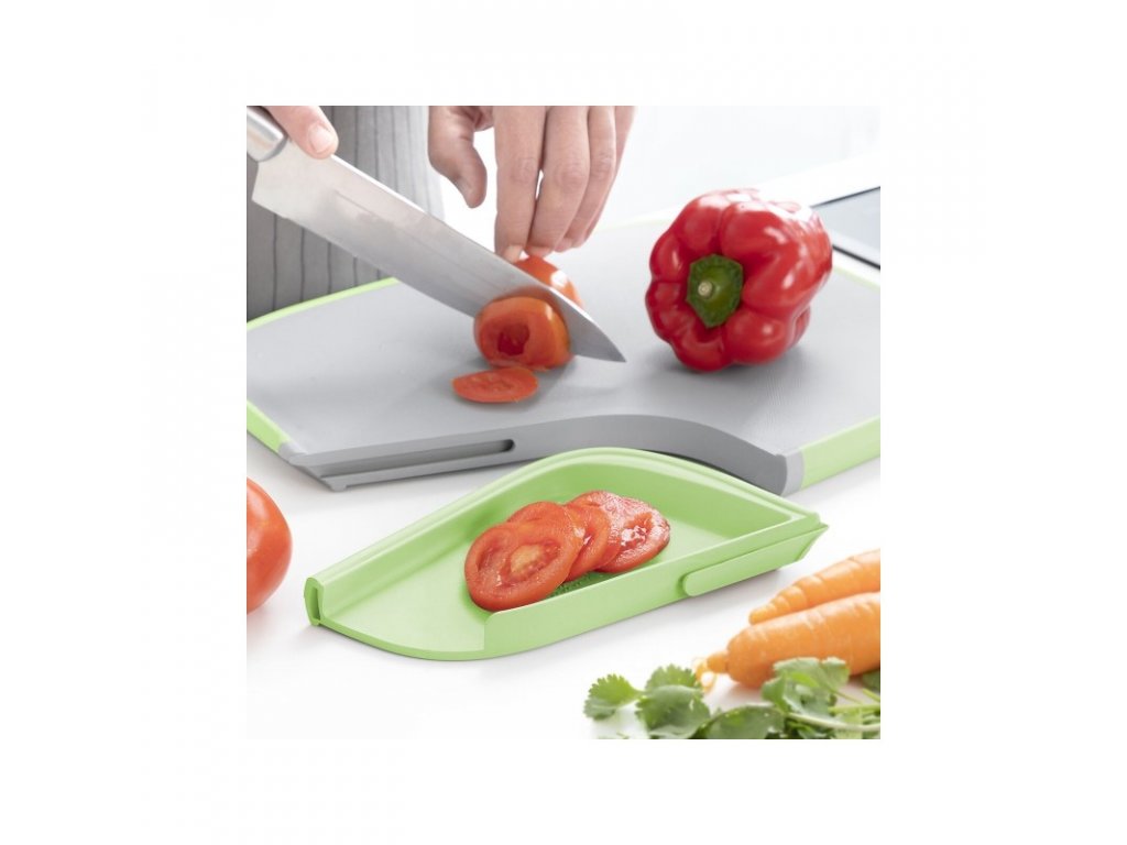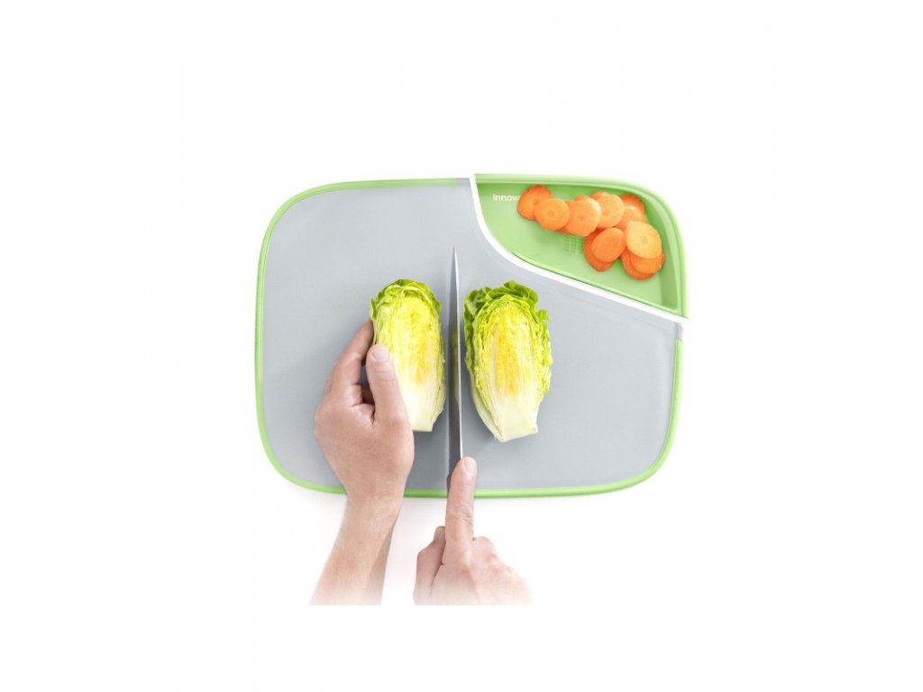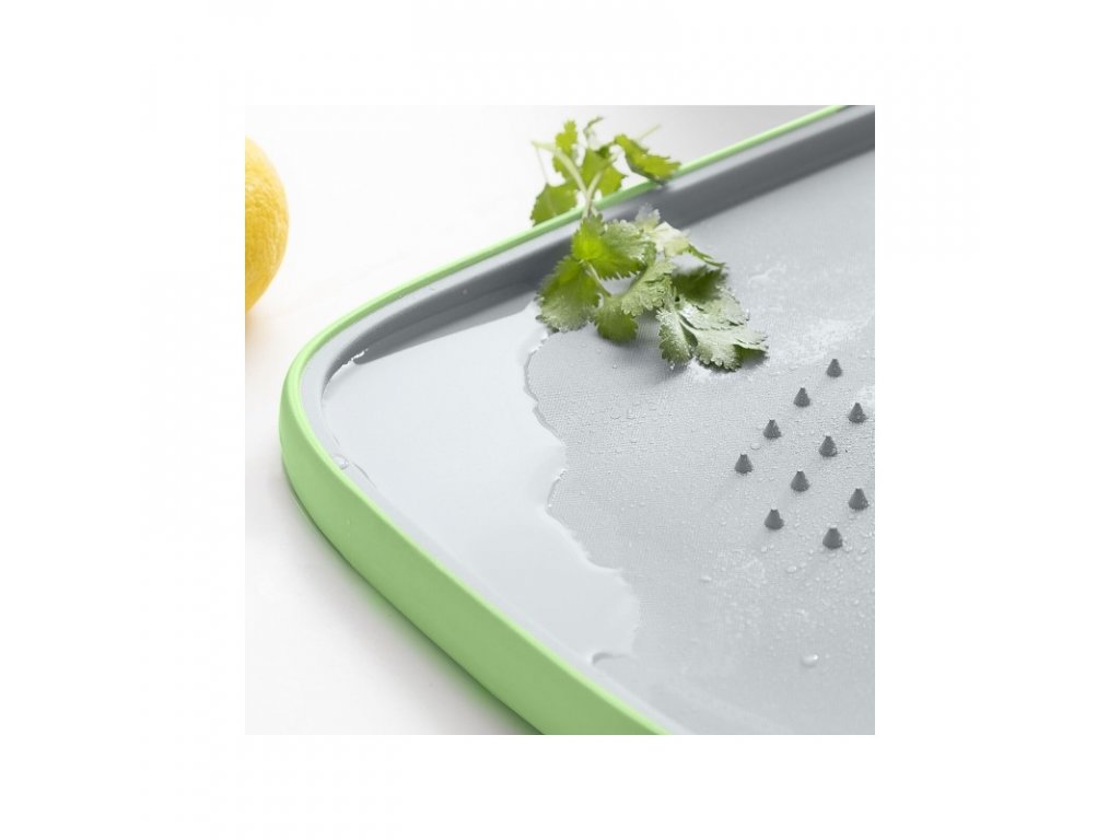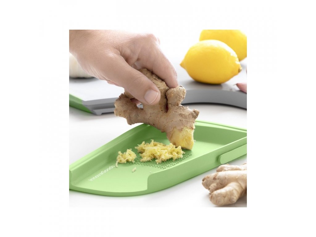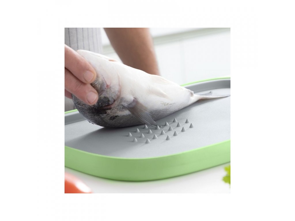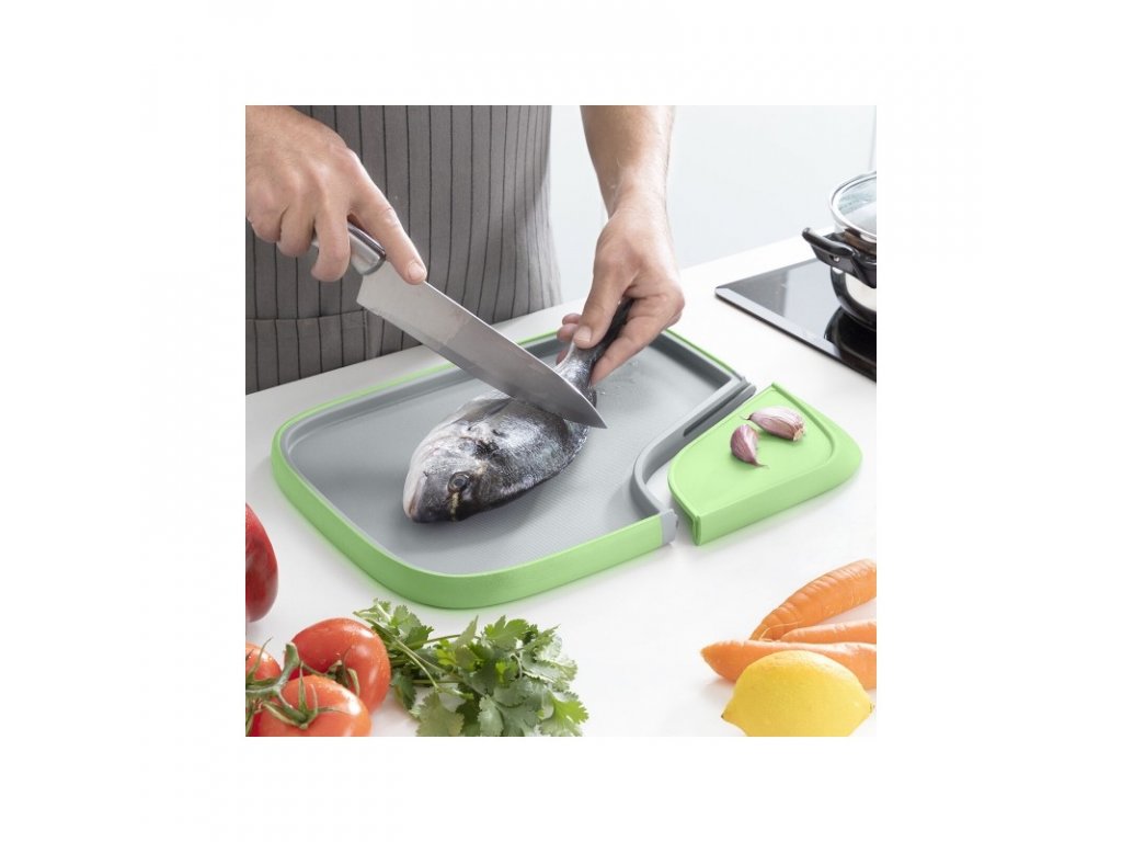 Eredeti és sokoldalú vágódeszka, amely a legmodernebb konyhákból sem hiányozhat multifunkcionális és többpozíciós kialakításának köszönhetően, hiszen többféle lehetőséget kínál az ételkészítés során felmerülő feladatok megkönnyítésére. Lehetővé teszi a kényelmes vágást, mert csúszásmentes és központi rögzítési pontokkal rendelkezik, így az étel nem csúszik. Ezen kívül szétválasztható, az egyik vége reszelőként szolgál és levehető/leválasztható a tányérról, így nagyon hasznos az apróra vágott vagy lereszelt ételek tárolására és könnyen beletehetjük őket az edénybe, serpenyőbe. Ez a konyhai munkalap is kétoldalas, mivel szükség szerint használhatja, vagy mindkét oldalán használhatja. A megemelt él megakadályozza a kifolyást, így ideális az élelmiszerek kiolvasztásához anélkül, hogy a víz a konyhapultra ömlik. Segít fenntartani a rendet és helyet takarít meg a konyhában, tartós és könnyen tárolható. Könnyen tisztítható és mosogatógépben is használható.