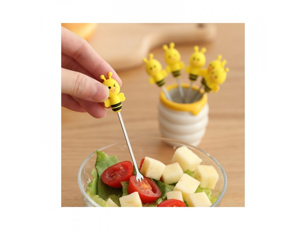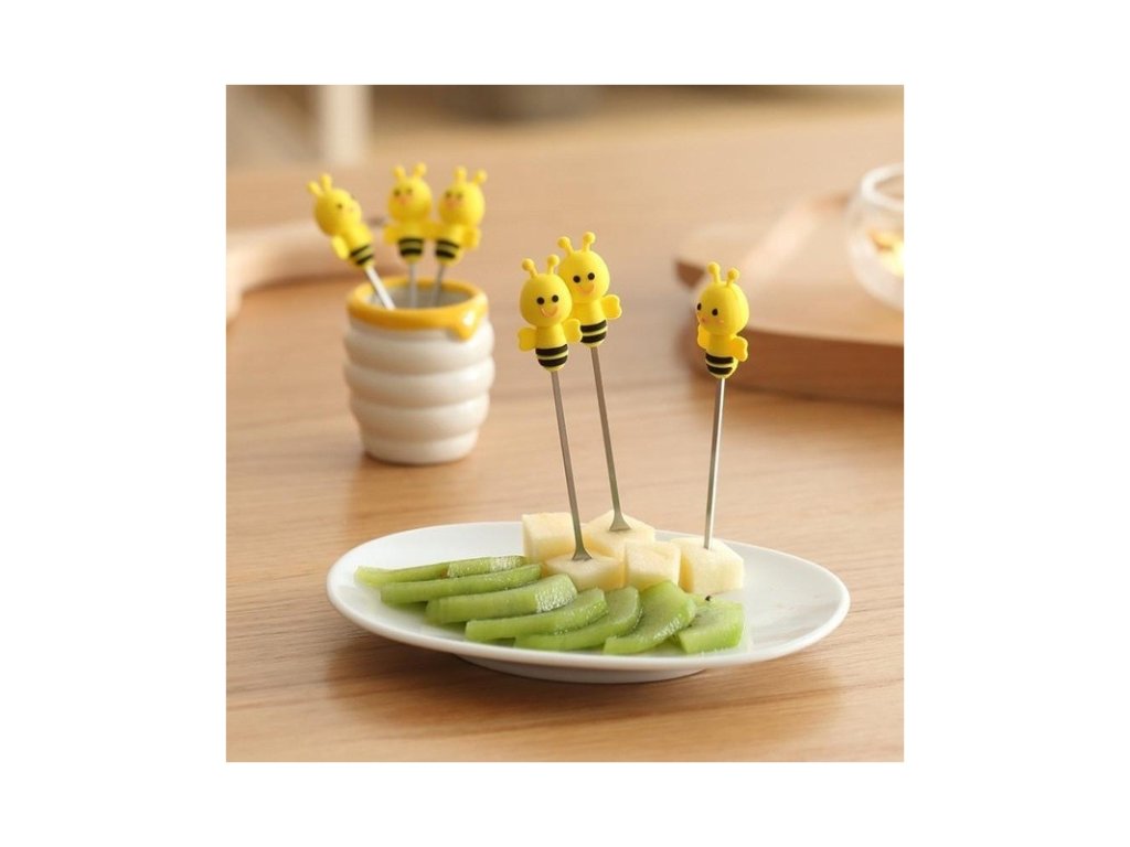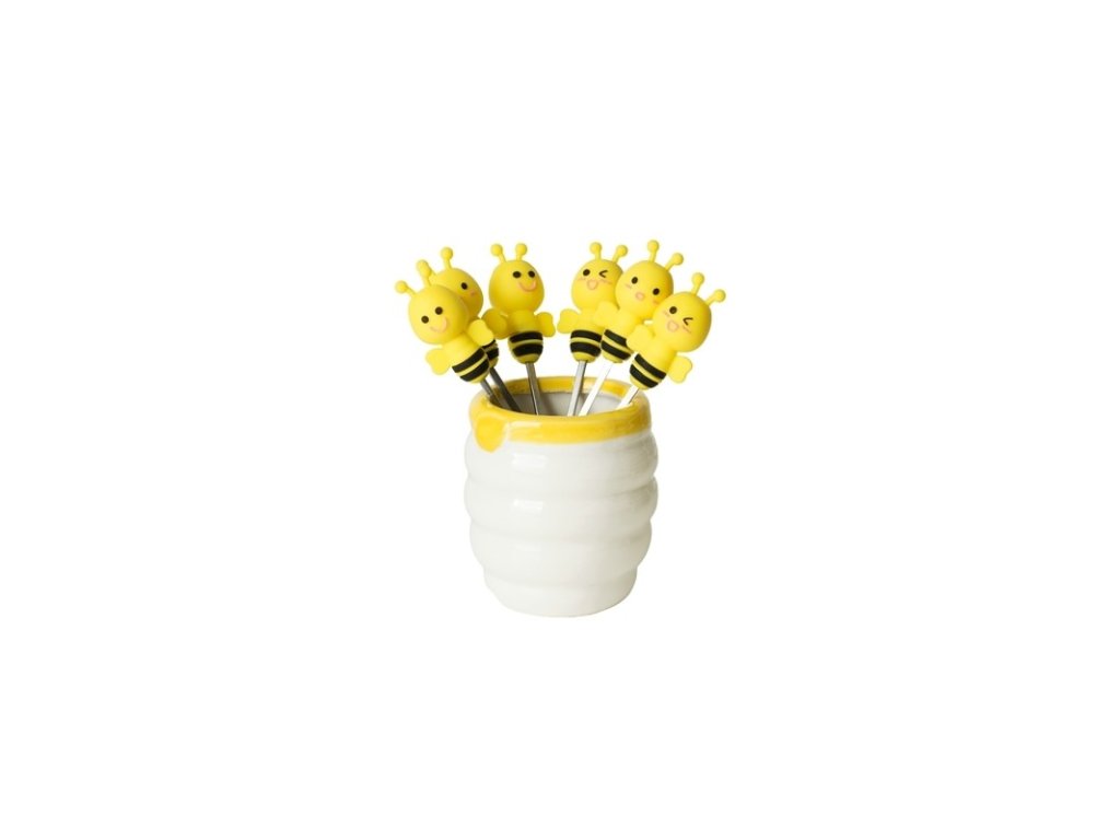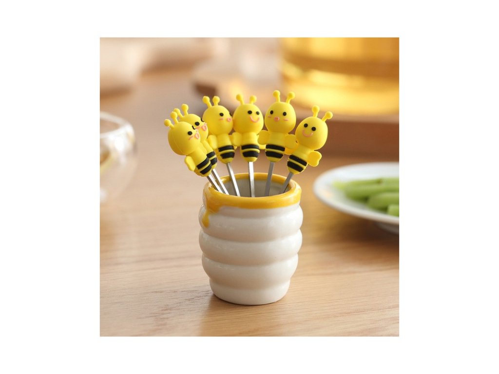 Méh partivillák készlete porcelán tartályban. Felejtsd el a klasszikus fogpiszkálókat, és vásárolj villákat, amelyek a vidám méheknek köszönhetően minden eseményt felvidítanak. A villák alkalmasak családi ünnepségekre vagy bulikra.