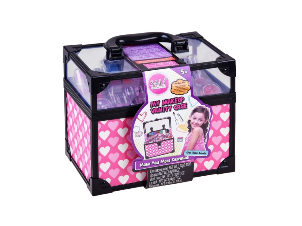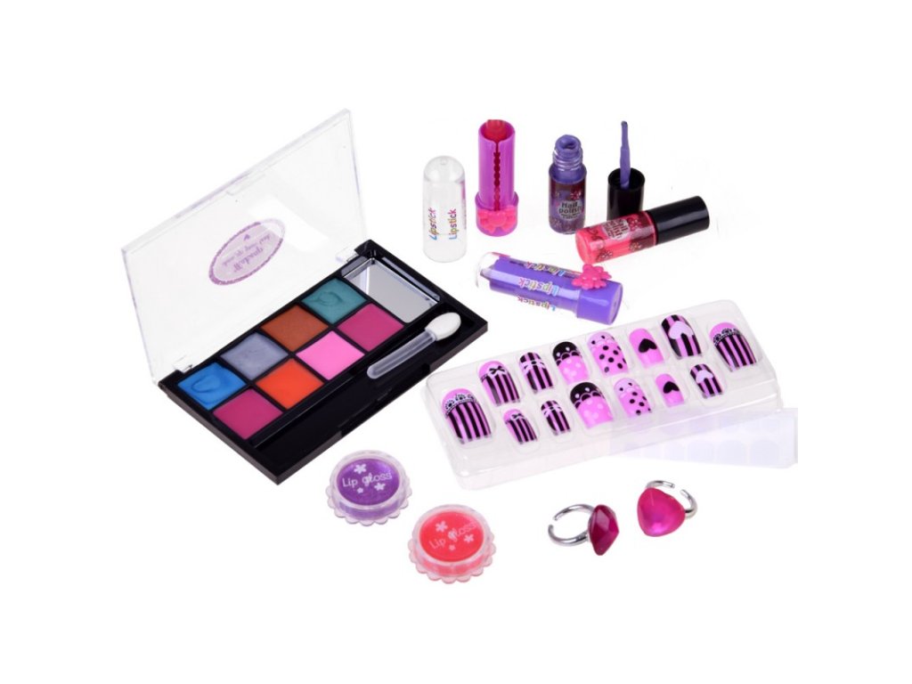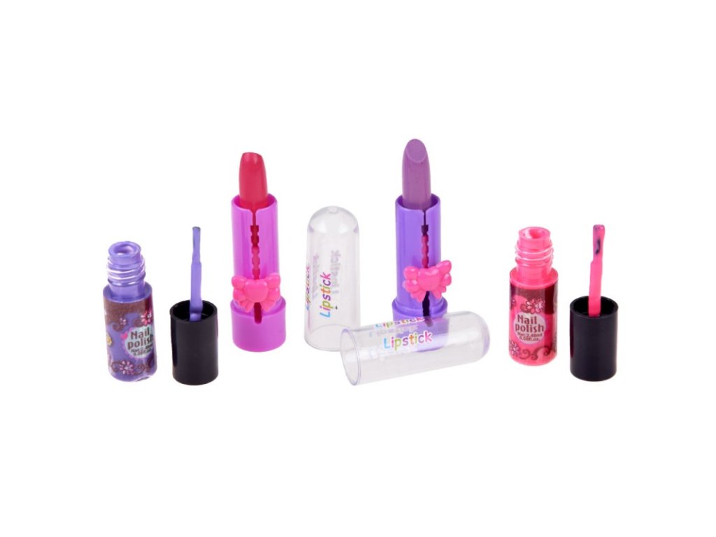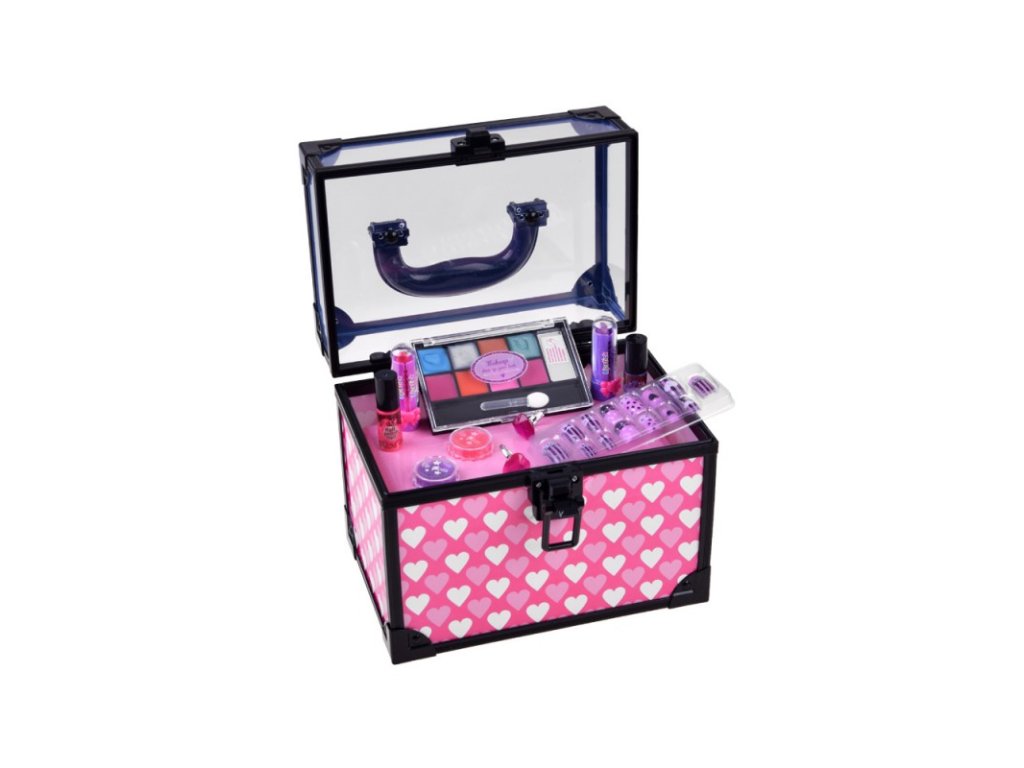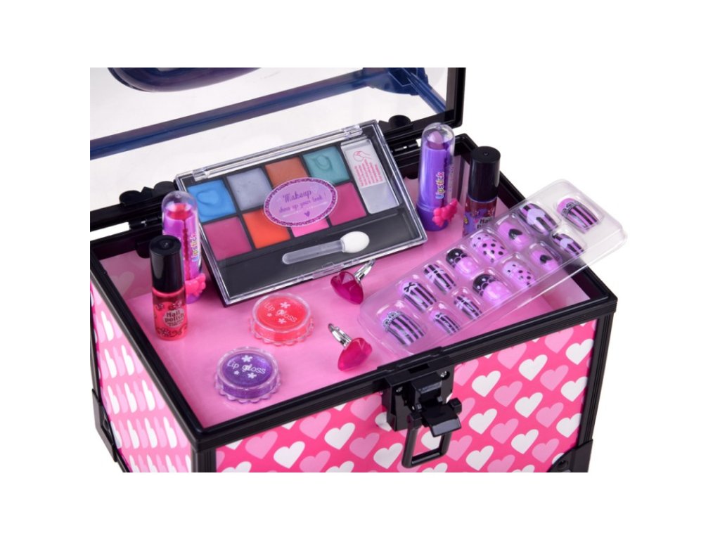 Bájos tok kozmetikumokkal egy kis szépség számára, aki szereti utánozni édesanyja kozmetikai eljárásait, és ugyanúgy szépülni a tükör előtt, mint ő. A letörölhető kozmetikumokkal teli varázslatos tok tökéletes alternatív ajándék minden kis hercegnőnek. A kozmetikumok egy nagy, szépen díszített bőröndben vannak elhelyezve, a hatás kinyitva lenyűgöző. A készlet tökéletes lesz egy anya és lánya otthoni lazításához, vagy lánya és barátnői szórakozásához. A sminkleckék lehetővé teszik a gyermek számára, hogy megértse, miért van szükség a kozmetikus szakmára, és egy kozmetikai sminkkel kapcsolatos játék hasznos lehet például egy álarcos buli előtt az iskolában vagy egy tematikus születésnapi bulin. A kozmetikumokkal, szájfényekkel, árnyékolókkal, rúzsokkal vagy körmökkel teli bőröndben végtelen lesz a szórakozás az otthoni fürdőben. A tokban elhelyezett kozmetikumok teljesen biztonságosak, minősítettek, nem okoznak allergiát és nagyon könnyen moshatók.